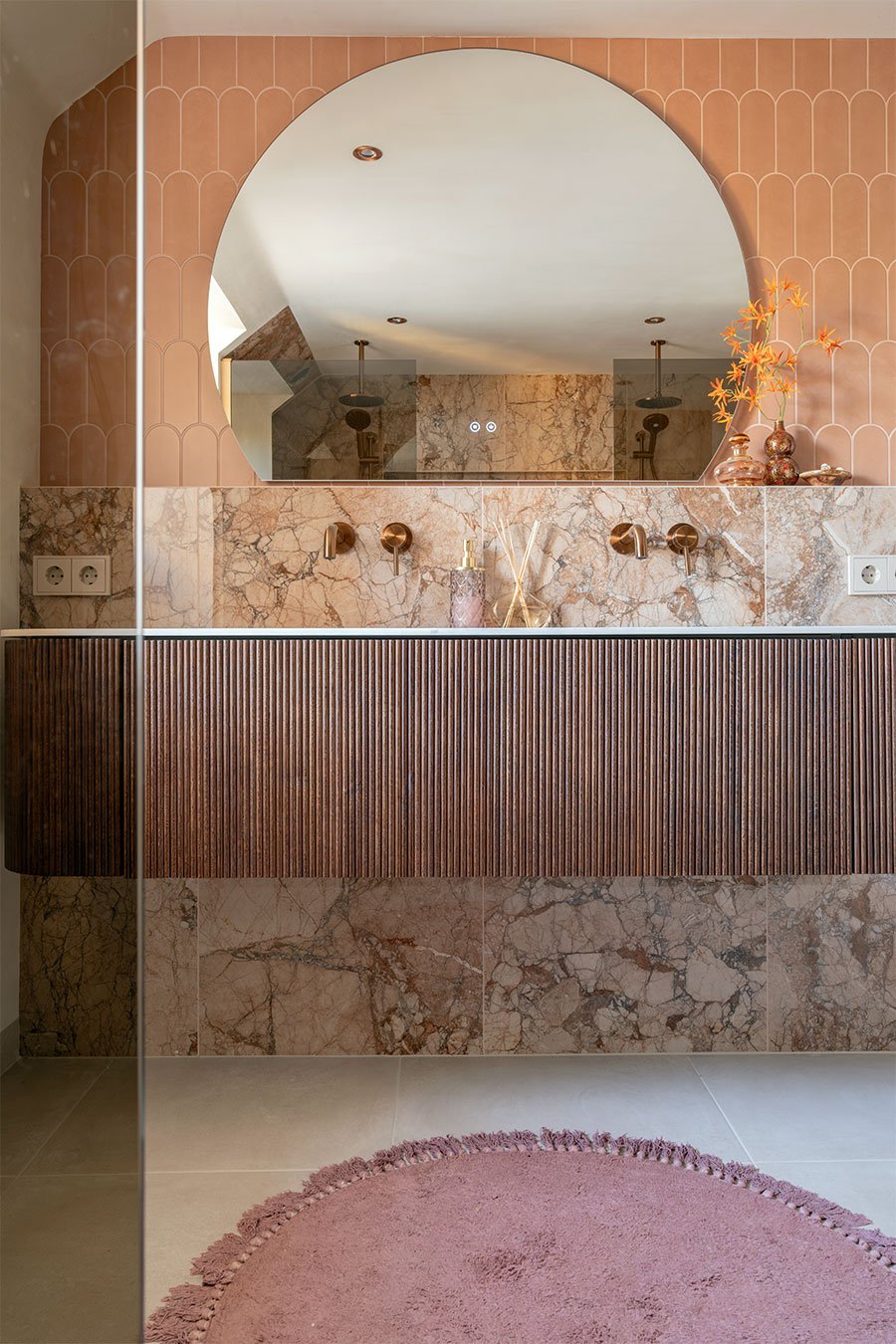 Un meuble double vasque était un indispensable pour éviter les bousculades matinales et garantir une utilisation fluide au quotidien. Fidèles à leur esthétique audacieuse « more is more », ils ont misé sur des couleurs chaudes pour insuffler une atmosphère chaleureuse et raffinée à leur salle de bains.
