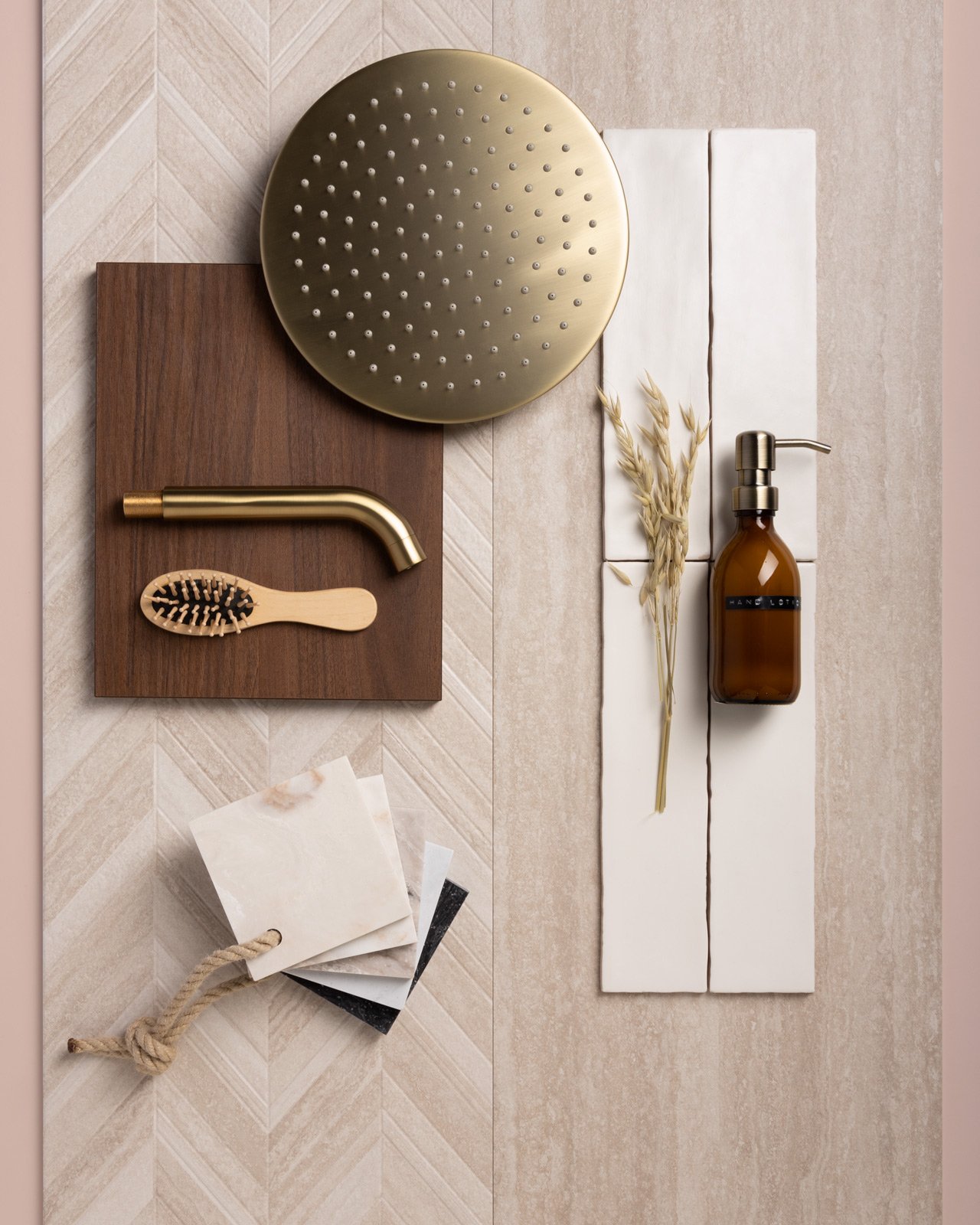 Des teintes claires posent les bases de ce moodboard, sans jamais tomber dans la monotonie. Le carrelage en chevron couleur sable insuffle rythme et dynamisme, tandis que les carreaux muraux façonnés à la main apportent une touche douce et naturelle. Le jeu des textures et des formes crée une atmosphère raffinée et apaisante, subtilement animée par une tension visuelle maîtrisée.