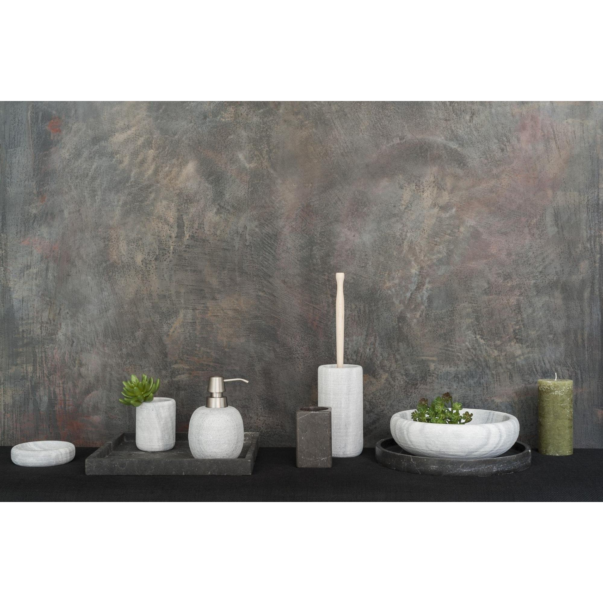 Ce produit est un exemple de style intemporel et de raffinement. L'utilisation de pierre naturelle lui confère une apparence unique que vous ne trouverez nulle part ailleurs. La teinte gris foncé ajoute une touche subtile et luxueuse sans dominer. Il s'intègre donc parfaitement dans toute salle de bains, que vous optiez pour une décoration minimaliste ou pour une ambiance chaleureuse et naturelle. Avec cet accessoire, vous faites un choix conscient pour une salle de bains qui n'est pas seulement fonctionnelle, mais qui invite également à la détente et au plaisir.