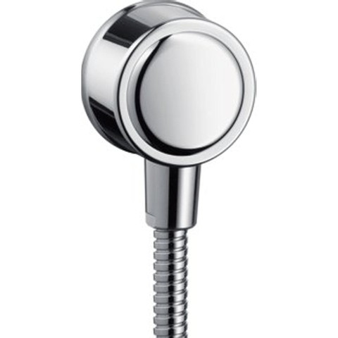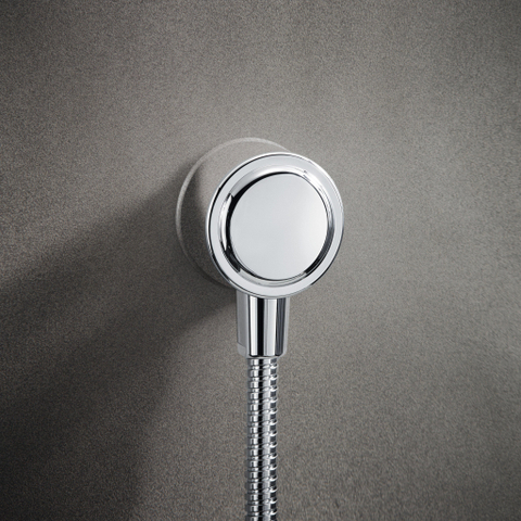 - Raccord mural de couleur chrome pour un raccordement propre et fixe de votre flexible de douche.