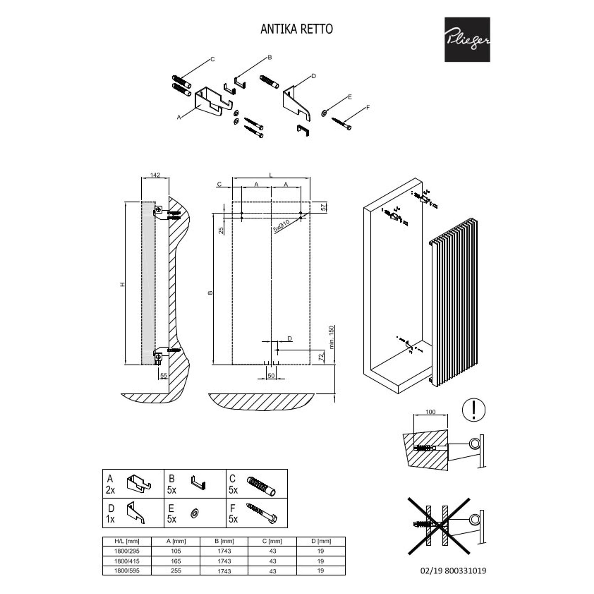 Plieger Antika Retto radiateur design vertical raccordement central 1800x295mm 994W pierre de sable