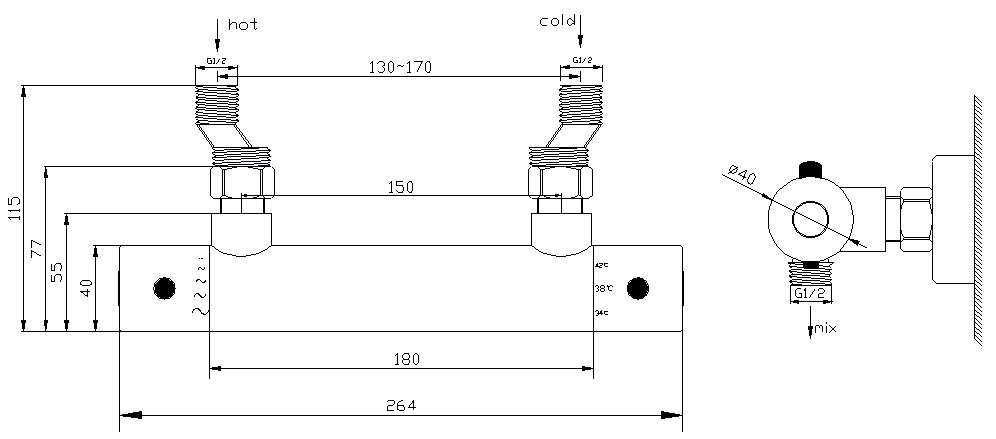 Mélangeur de douche thermostatique Rio de Wiesbaden. Boutons en laiton entier, avec une finition acier brossé. Fonction économiseur d'eau et limiteur de température à 38 degrés.