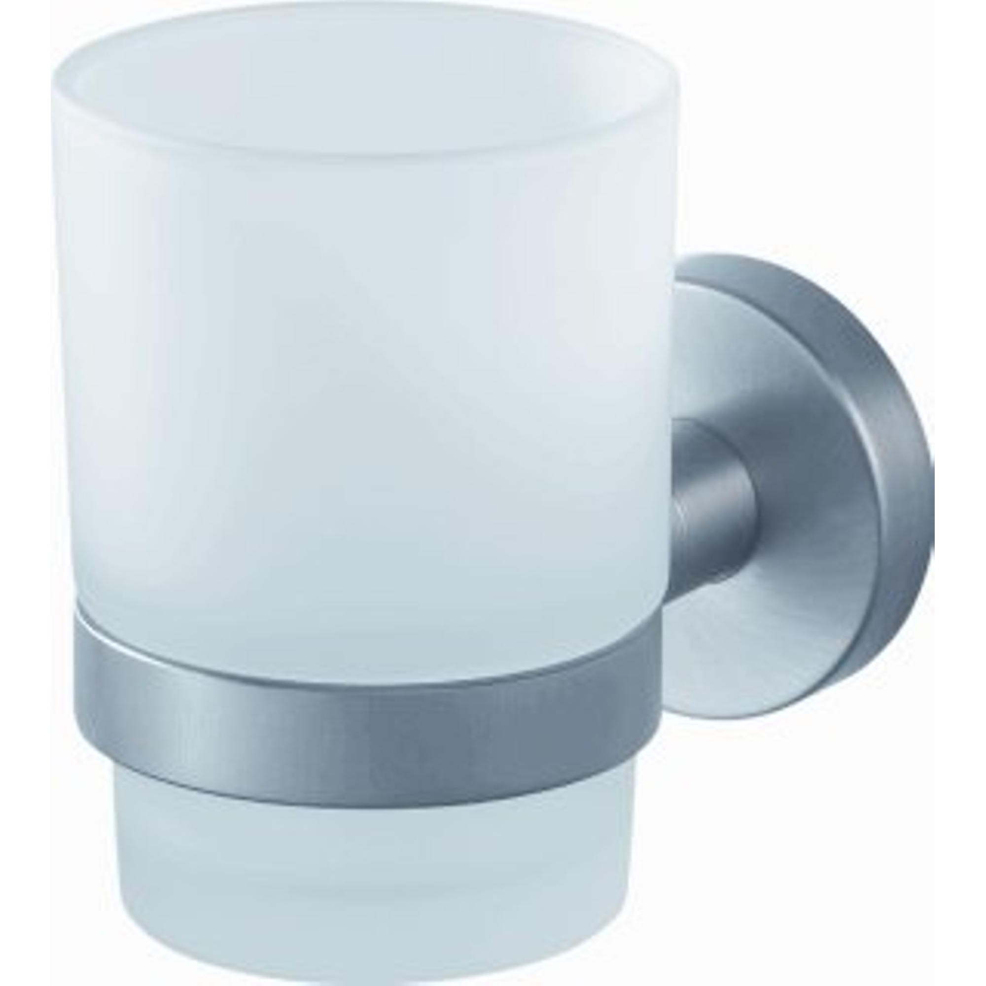 - Porte-gobelet moderne en chrome mat avec aspect inox, adapté à un style de salle de bains épuré et contemporain.