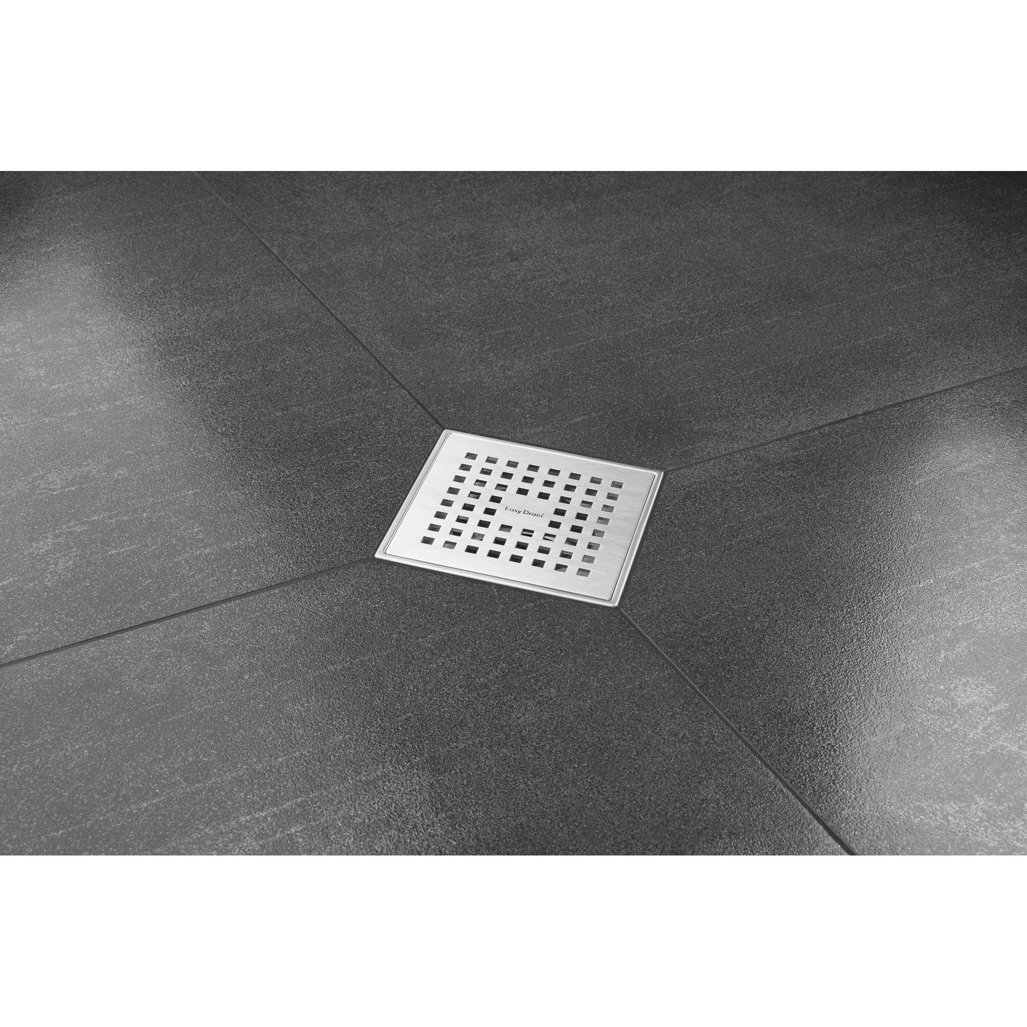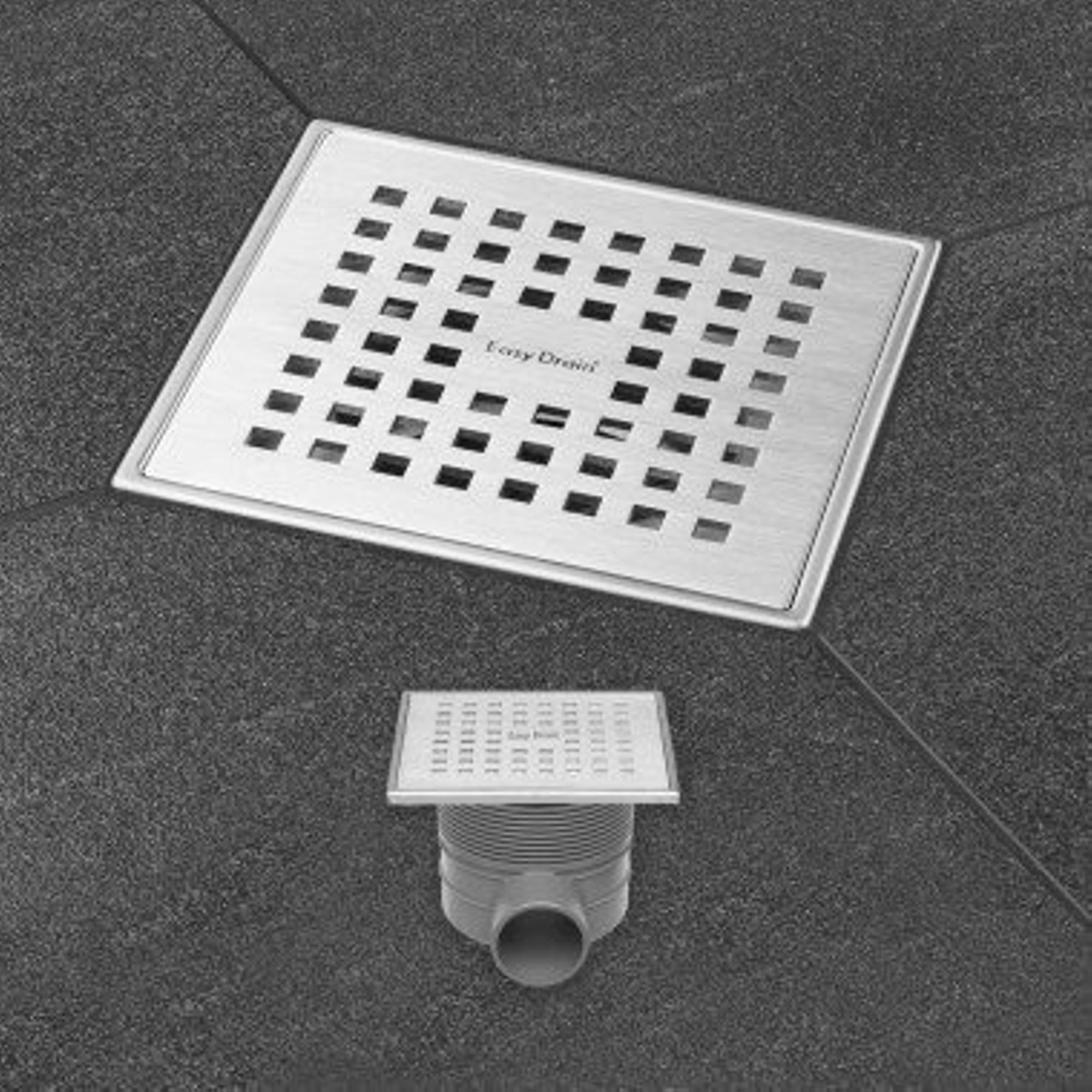 - Siphon de sol carré compact de 15x15 cm, idéal pour les douches à l’italienne et les sols carrelés.
