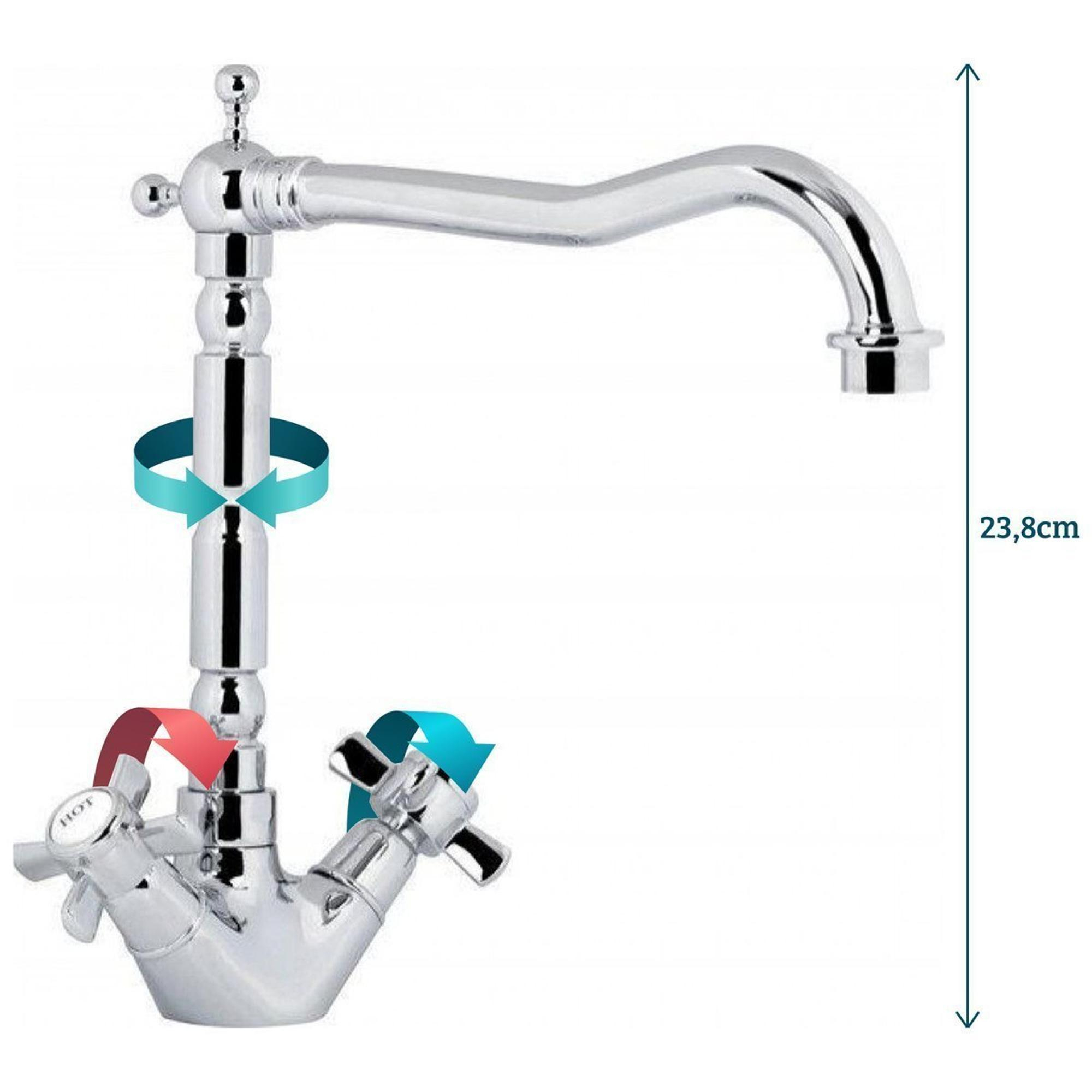 Le robinet de cuisine Plieger James avec bec droit a une apparence classique en couleur chrome. Il a donc un aspect classique mais est équipé d'un bec pivotant, de disques en céramique durables et de flexibles de raccordement avec un raccord fileté intérieur 3/8". La commande de ces robinets est opposée par rapport aux robinets normaux. En effet, il s'ouvre dans le sens des aiguilles d'une montre, au lieu de dans le sens inverse.