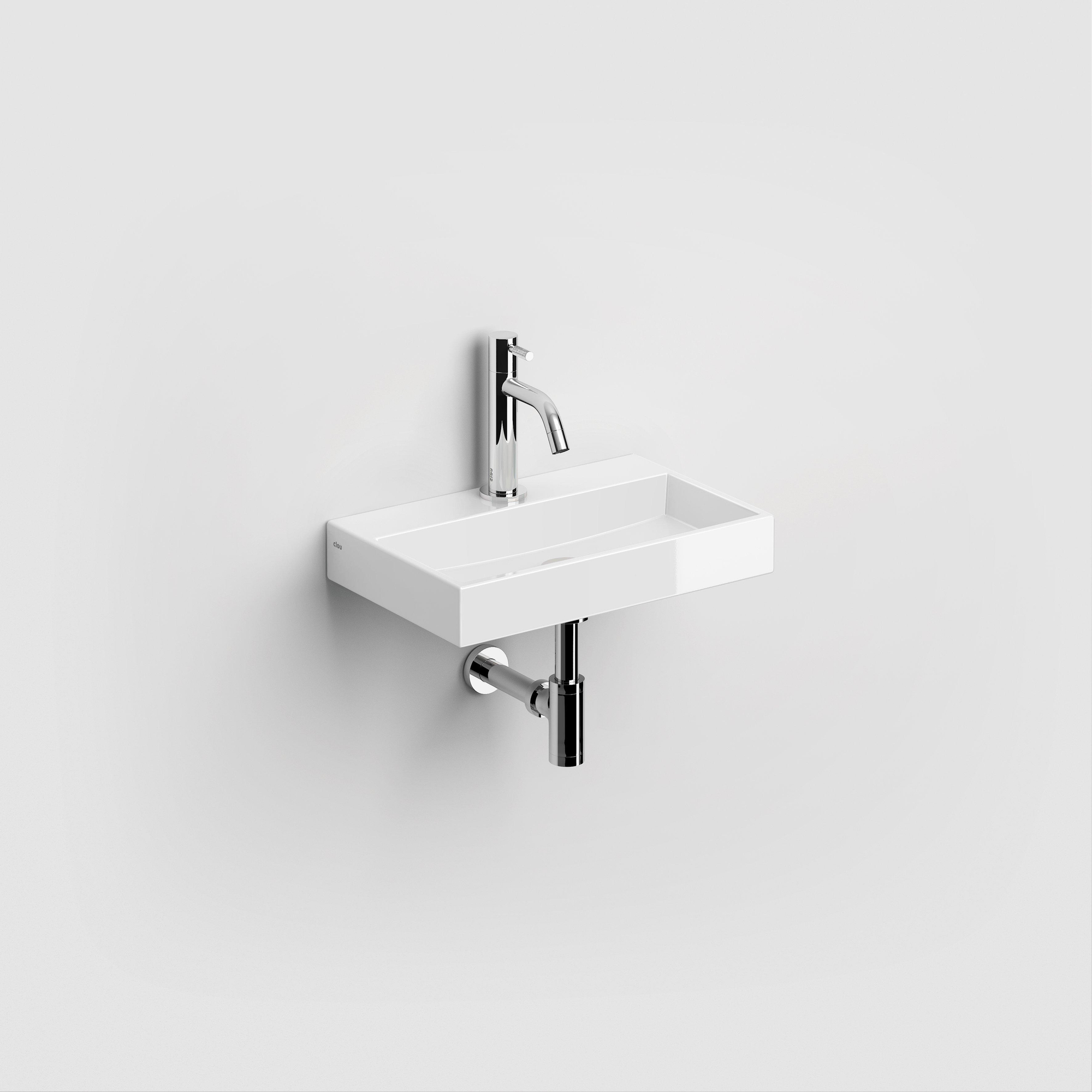 Le lave-mains est doté d'un trou de robinet au centre, ce qui vous permet d'installer facilement un petit robinet de lave-mains bien proportionné à l'ensemble. L'arrière droit permet une installation murale nette et offre de l'espace pour dissimuler proprement les conduites. En l'absence de trop-plein, le design paraît encore plus calme et minimaliste, ce qui convient parfaitement aux espaces WC modernes. Associez le lave-mains à un siphon et un clapet de vidage assortis en chrome, noir ou métal brossé afin de prolonger le style de votre salle de bains jusque dans les moindres détails.