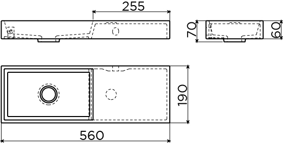 - Lave-mains compact de 56x19 cm, idéal pour les petits WC et les murs étroits
