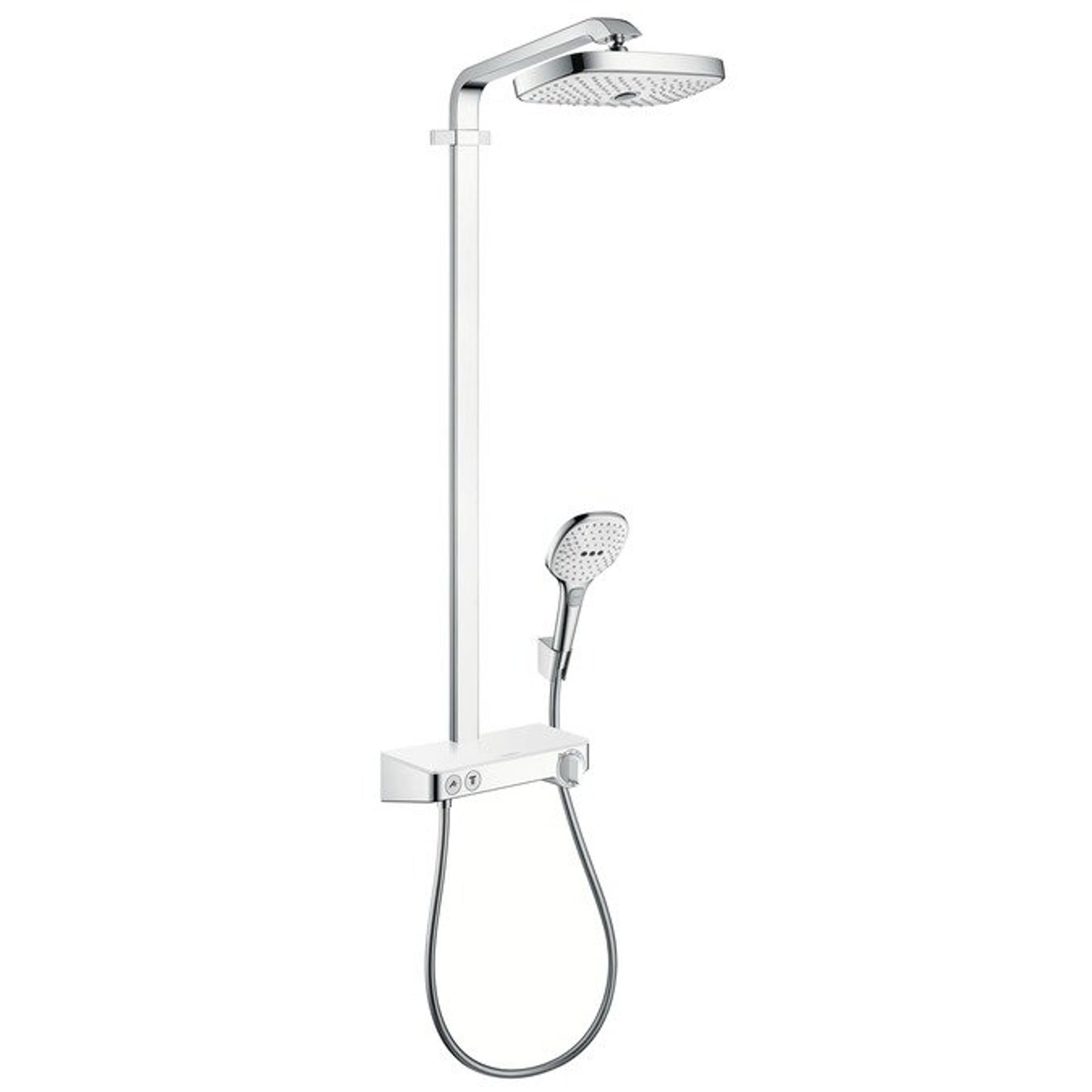 Hansgrohe Raindance Select E300 showerpipe: avec tablette de douche 300 robinet thermostatique apparent avec douchette 3 jets et pomme de douche 2 jets blanc/chrome