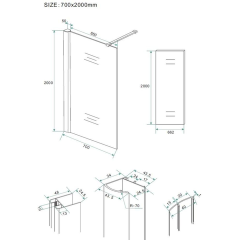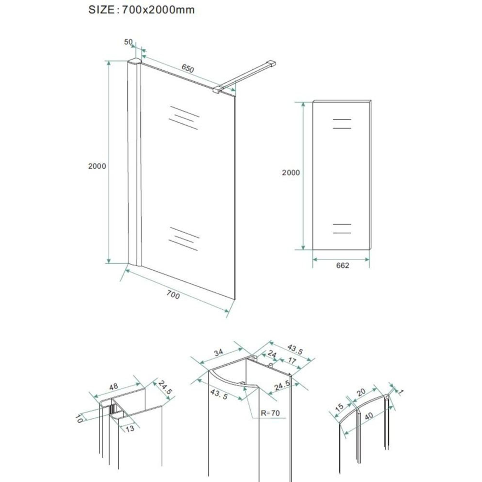 - Dimensions : 700 x 2000 x 10 mm (largeur x hauteur x épaisseur du verre) – idéal pour de nombreux formats de salle de bains