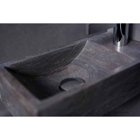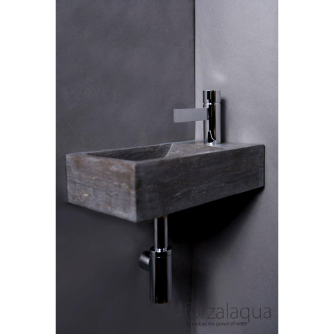 Magnifique lave-mains en pierre naturelle. design exclusif et fabriqué à partir d'un seul bloc de pierre naturelle. Ce modèle est disponible en plusieurs types de pierre naturelle et le trou de robinet peut être réalisé à gauche ou à droite. Ce lave-mains en pierre naturelle peut être suspendu grâce aux trous de fixation présents des 2 côtés. La pierre naturelle est magnifique et apporte une chaleur et une exclusivité supplémentaires à votre salle de bain ! Elle nécessite cependant un peu plus d'entretien qu'un lavabo en céramique blanc standard. Il est donc conseillé de ne pas utiliser d'eau à plus de 60 degrés Celsius et de nettoyer le lavabo avec des produits de nettoyage doux. Nous vous conseillons également d'acquérir notre kit d'entretien Forzalaqua. Ce kit se compose d'un agent d'imprégnation et d'un nettoyant. L'agent d'imprégnation protégera la surface de la pierre naturelle plus longtemps et fermera les pores, ce qui réduit l'entrée de salissures. Un contact avec des produits agressifs peut entraîner une décoloration de la couche supérieure. Enlevez immédiatement les produits corrosifs avec de l'eau. Laissez également le lavabo propre et sec après utilisation. Nous vous souhaitons beaucoup de plaisir avec votre produit Forzalaqua !