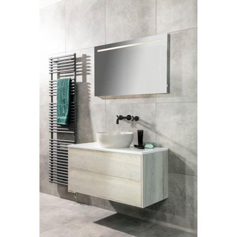 Ce miroir avec éclairage LED intégré horizontal + chauffage et éclairage indirect inférieur fournit une lumière idéale pour le rasage, le maquillage ou vos soins quotidiens. L'éclairage LED intégré assure une répartition homogène de la lumière, ce qui limite au maximum les ombres et vous offre une image claire dans votre salle de bains. Le chauffage intégré empêche la formation de buée sur le miroir de salle de bains, de sorte qu'il reste rapidement net après une douche chaude. L'éclairage indirect inférieur crée une lueur douce le long du meuble vasque ou du plan de toilette et contribue à un confort et un luxe supplémentaires dans l'espace sanitaire.