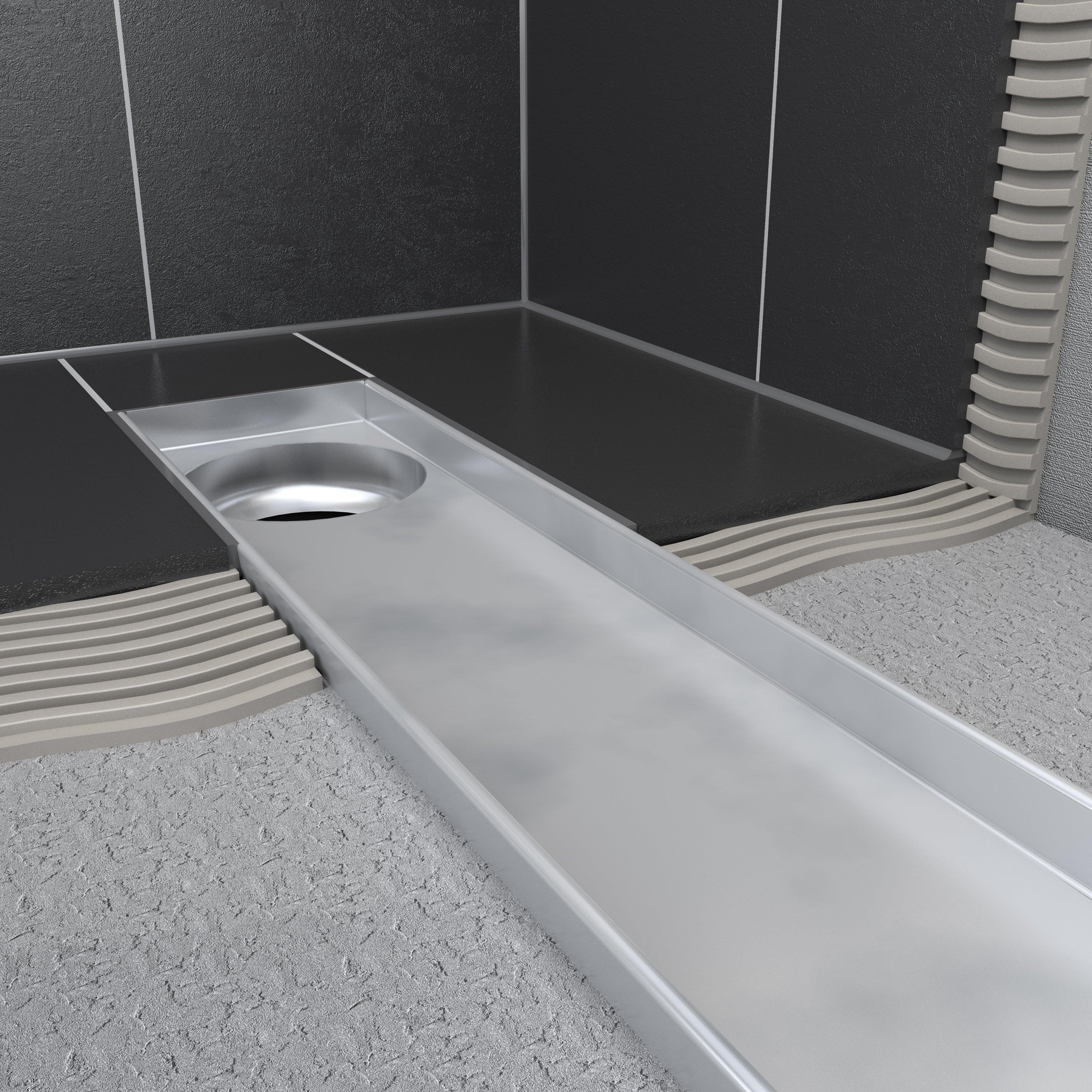 Avec une profondeur d'encastrement d'environ 79 mm, cet élément encastrable est particulièrement adapté aux situations où vous ne disposez pas de beaucoup d'espace dans le sol, comme lors de rénovations ou sur des planchers en bois. La longueur de 70 cm et une largeur de 9,8 cm en font une dimension polyvalente qui convient à la plupart des espaces de douche. Comme le caniveau est réalisé sans bride, vous pouvez le raccorder sans joint apparent au revêtement de sol selon le système d'étanchéité choisi. Le siphon excentré et la sortie latérale horizontale rendent le positionnement particulièrement flexible, de sorte que vous puissiez placer l'évacuation exactement là où votre réseau de conduites le permet. Vous combinez ainsi ingéniosité technique et sol de douche visuellement calme.