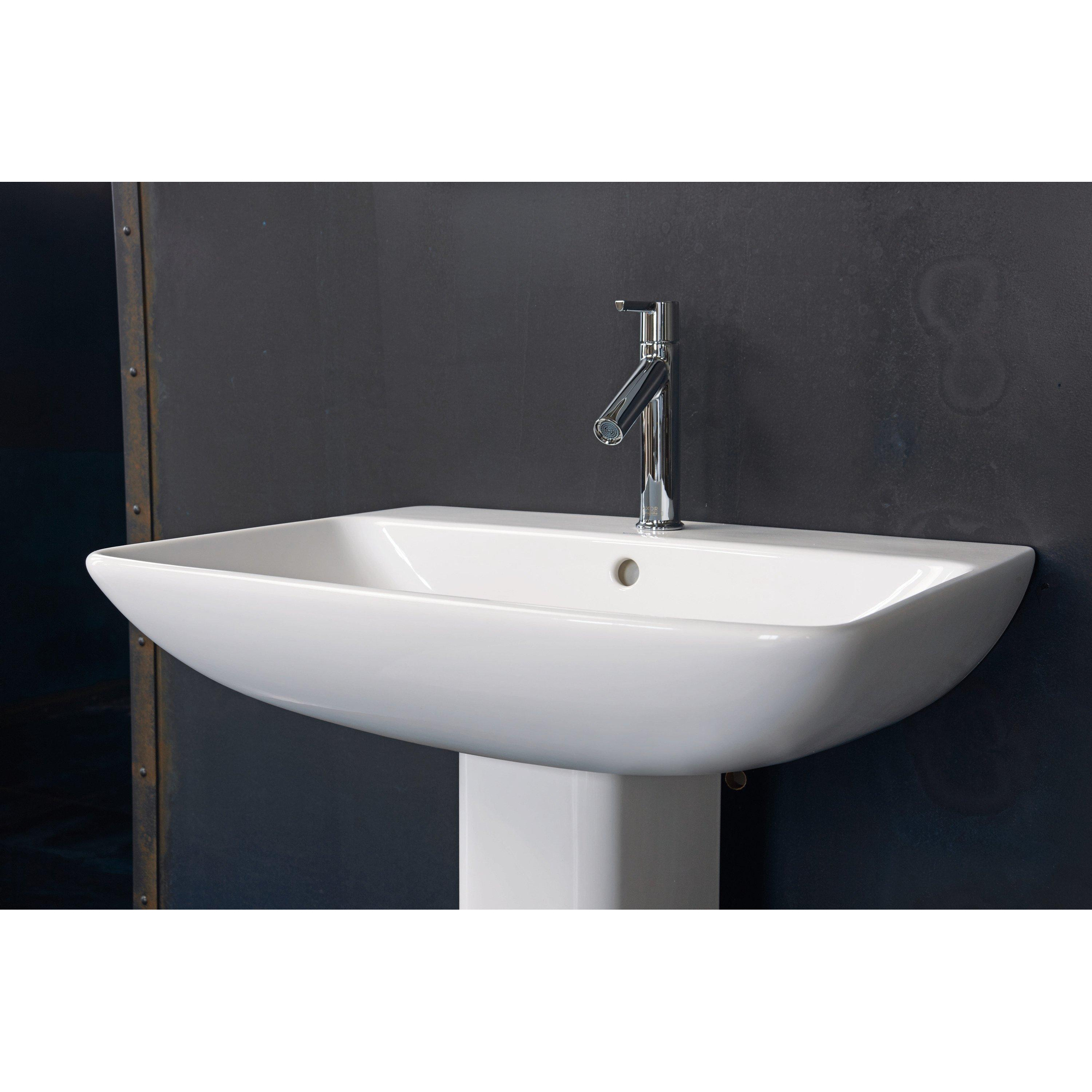 Si vous recherchez un lavabo élégant qui trouve parfaitement sa place aussi bien dans une salle de bains design épurée que dans une salle de bains familiale intemporelle, ce modèle est un choix particulièrement judicieux. Grâce à son format généreux de 65 cm, vous disposez d’un espace confortable pour vous laver les mains, vous rafraîchir le visage ou vous tenir au lavabo avec votre enfant, sans que l’ensemble paraisse immédiatement surchargé ou agité. La forme rectangulaire avec trou de robinet central et tablette de robinetterie pratique facilite la combinaison avec un beau mitigeur de lavabo et un distributeur de savon. Grâce aux lignes fines et à la céramique blanche brillante, ce lavabo s’accorde parfaitement avec des meubles modernes, mais aussi avec des styles plus classiques. De plus, il convient pour un montage sur meuble, avec colonne ou cache-siphon, ce qui vous laisse une grande liberté dans la manière d’aménager votre espace lavabo.