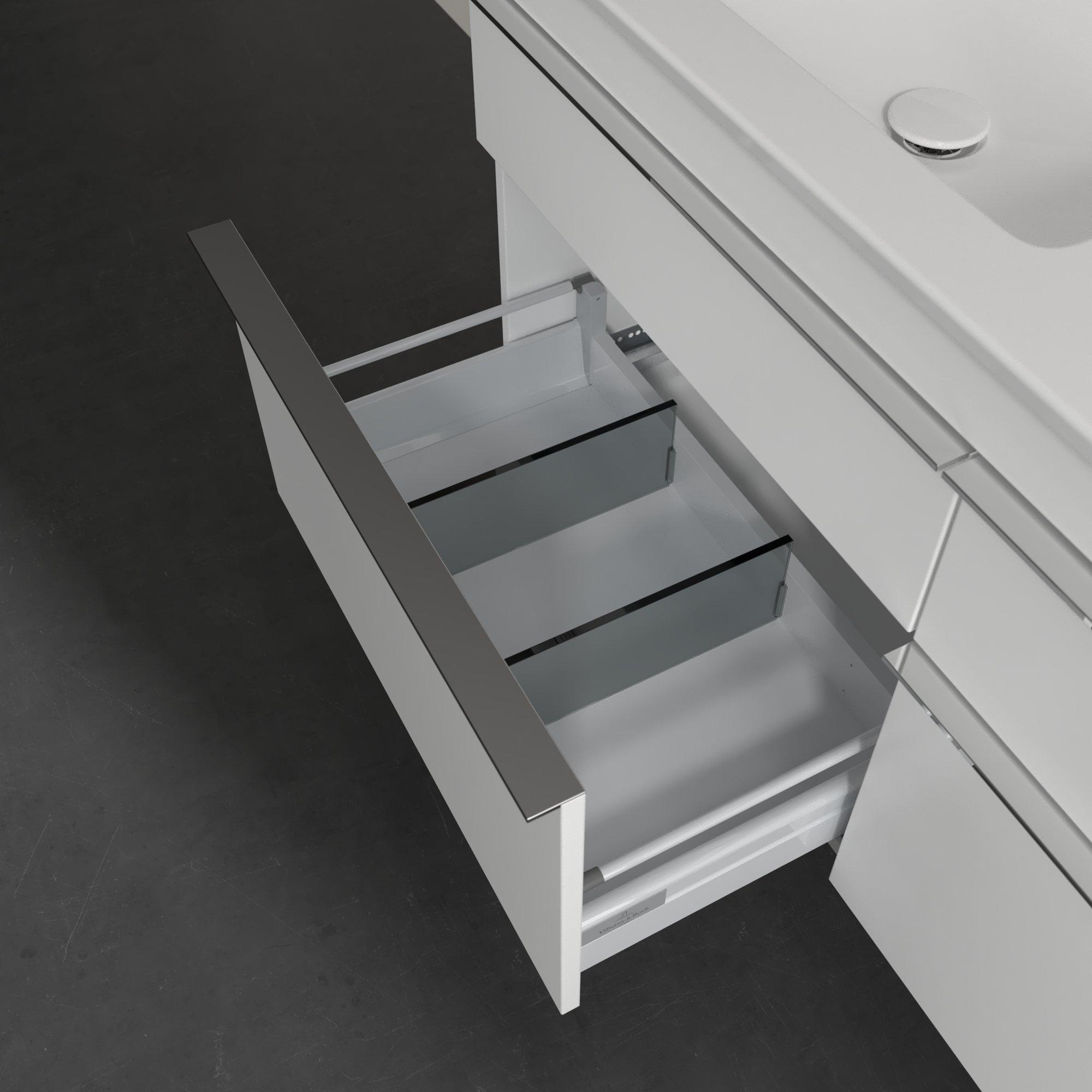 Avec une largeur de 125,3 cm et une hauteur de 59 cm, ce meuble bas suspendu offre un volume de rangement remarquablement important sans que votre sol soit encombré de paniers ou d’armoires indépendants. Les quatre tiroirs spacieux, entièrement extensibles, vous permettent d’accéder facilement à tout, même au fond. Pratique si vous souhaitez ranger de nombreux produits de soin, des serviettes ou des appareils électriques comme un sèche-cheveux ou un rasoir. Grâce aux séparations en verre réglables et aux boîtes d’accessoires fournies, vous pouvez organiser l’intérieur des tiroirs exactement comme vous le souhaitez. Vous créez ainsi facilement calme et clarté dans la salle de bains, même dans une vie de famille bien remplie.