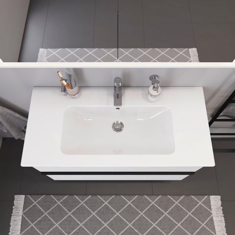 Les lignes extérieures droites combinées à des contours intérieurs doux et arrondis créent un contraste élégant : sobre à l’extérieur, confortable à l’usage. La grande largeur de 103 cm et la cuve unique, placée au centre, offrent beaucoup d’espace de mouvement pour se laver, se brosser les dents ou se maquiller. La forme rectangulaire s’accorde parfaitement avec les meubles de salle de bains modernes et assure une apparence ordonnée et symétrique. Grâce au trop-plein intégré, vous n’avez pas à craindre les débordements et l’ensemble reste sûr à l’utilisation. Les plateaux de dépose des deux côtés offrent un espace de rangement pratique à portée de main, ce qui réduit le nombre d’accessoires à poser et donne à votre salle de bains une apparence plus sereine.