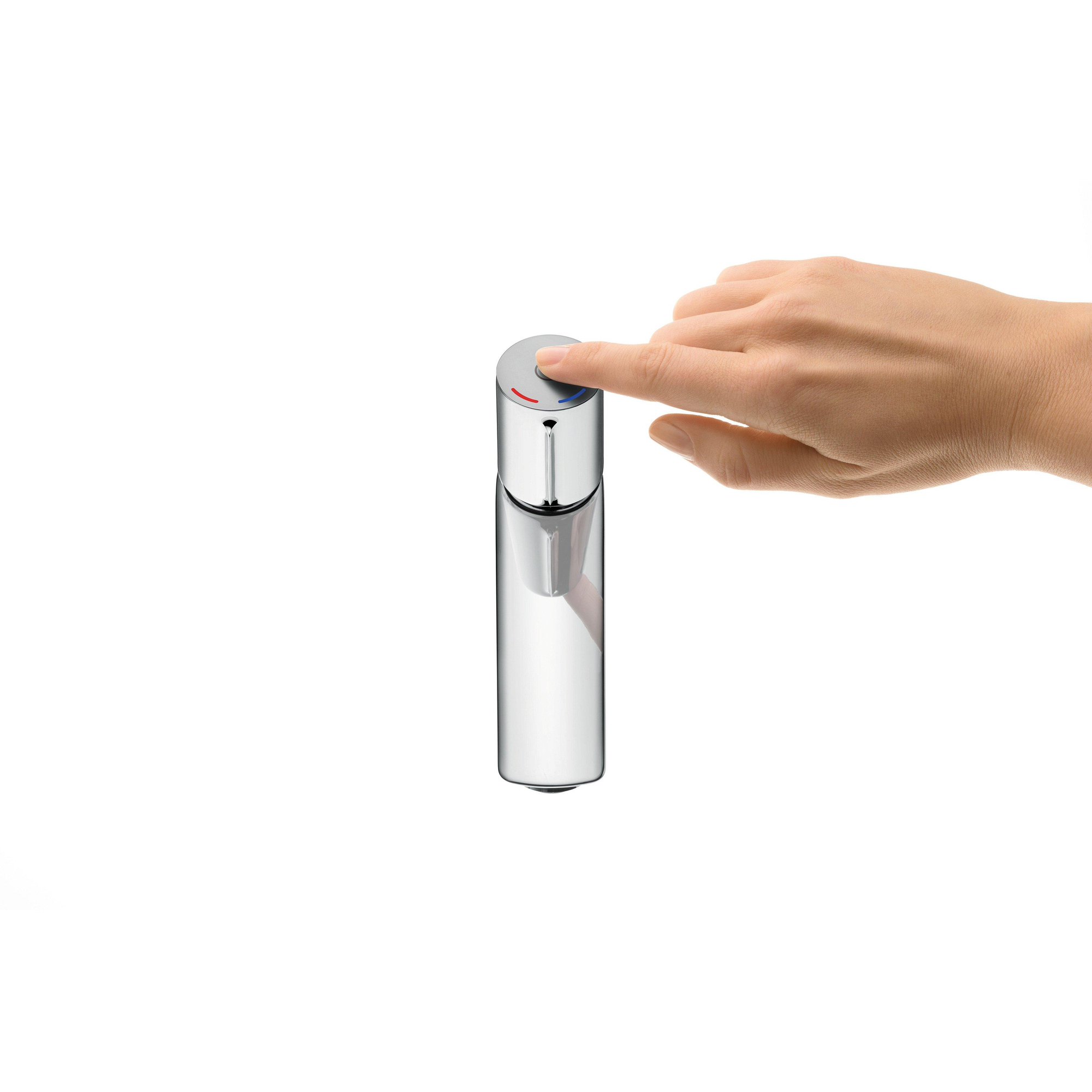 Avec une ComfortZone de 110 mm, ce robinet offre un espace supplémentaire entre le bec et le lavabo. Cela signifie que vous pouvez facilement vous laver les mains, rincer vos cheveux ou même remplir un seau sans contraintes. La commande par simple pression sur le bouton rend l'utilisation particulièrement simple et intuitive. De plus, vous pouvez régler la température de l'eau avec précision en tournant le bouton, ce qui vous garantit toujours la température idéale. Cela améliore le confort d'utilisation et rend chaque geste dans la salle de bains beaucoup plus agréable.
