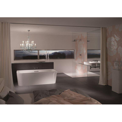Le bord de baignoire extrêmement étroit et les panneaux coniques sans joint confèrent à ce modèle une allure particulièrement raffinée. Visuellement, la baignoire apparaît comme un ensemble sculptural unique, ce qui en fait immédiatement le point focal de la pièce. La couleur blanche brillante et la structure de surface plane s’harmonisent parfaitement avec des carreaux modernes et des robinets aux lignes droites, mais se marient tout aussi facilement avec des matériaux naturels comme le bois et la pierre. Parce que la baignoire est demi autoportante et se place au milieu contre un mur, vous créez facilement un look luxueux comme dans les hôtels design, sans avoir à installer une baignoire entièrement autoportante.