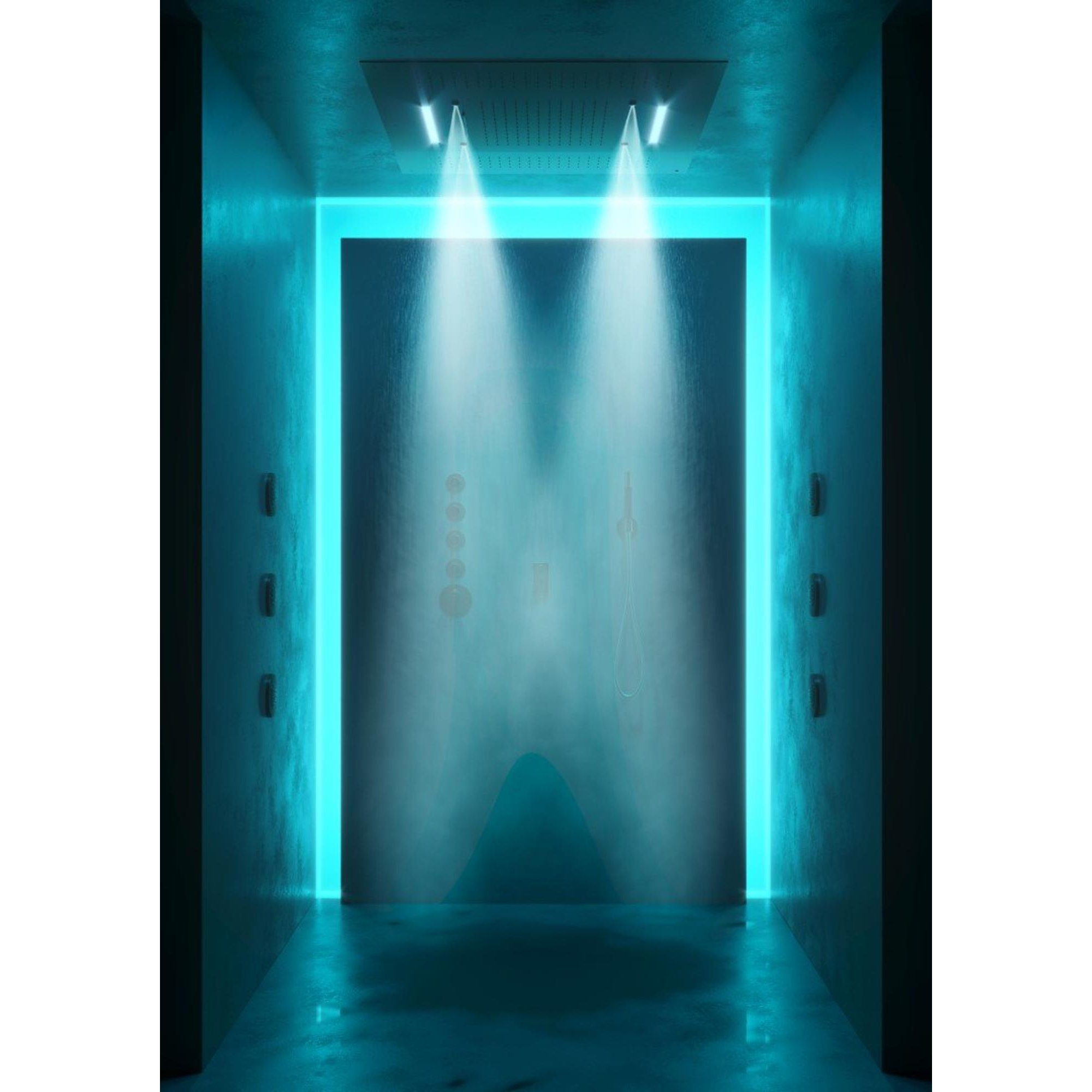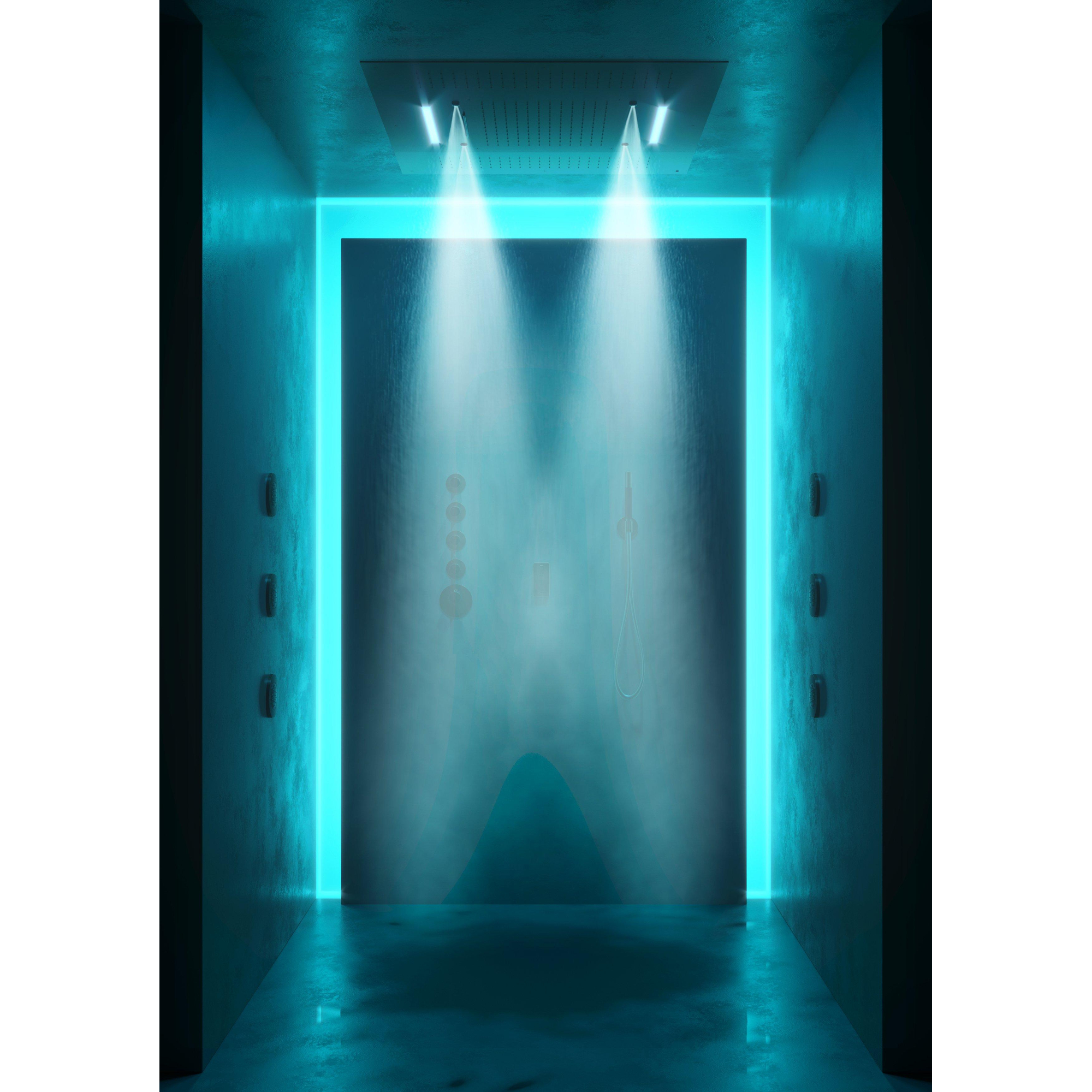Avec trois types de jets différents – douche de pluie, cascade et spray – cette douche de tête offre une polyvalence qui s’adapte à vos préférences personnelles. La double douche de pluie peut être commandée séparément, afin que vous choisissiez précisément le jet qui correspond à votre humeur. L’éclairage LED se commande sans fil à l’aide d’une télécommande, avec laquelle vous passez facilement des couleurs standard à des couleurs intenses, ou choisissez un programme de chromothérapie relaxant ou stimulant. La douche devient ainsi non seulement rafraîchissante, mais aussi une expérience sensorielle qui vous aide à vous détendre ou, au contraire, à faire le plein d’énergie.