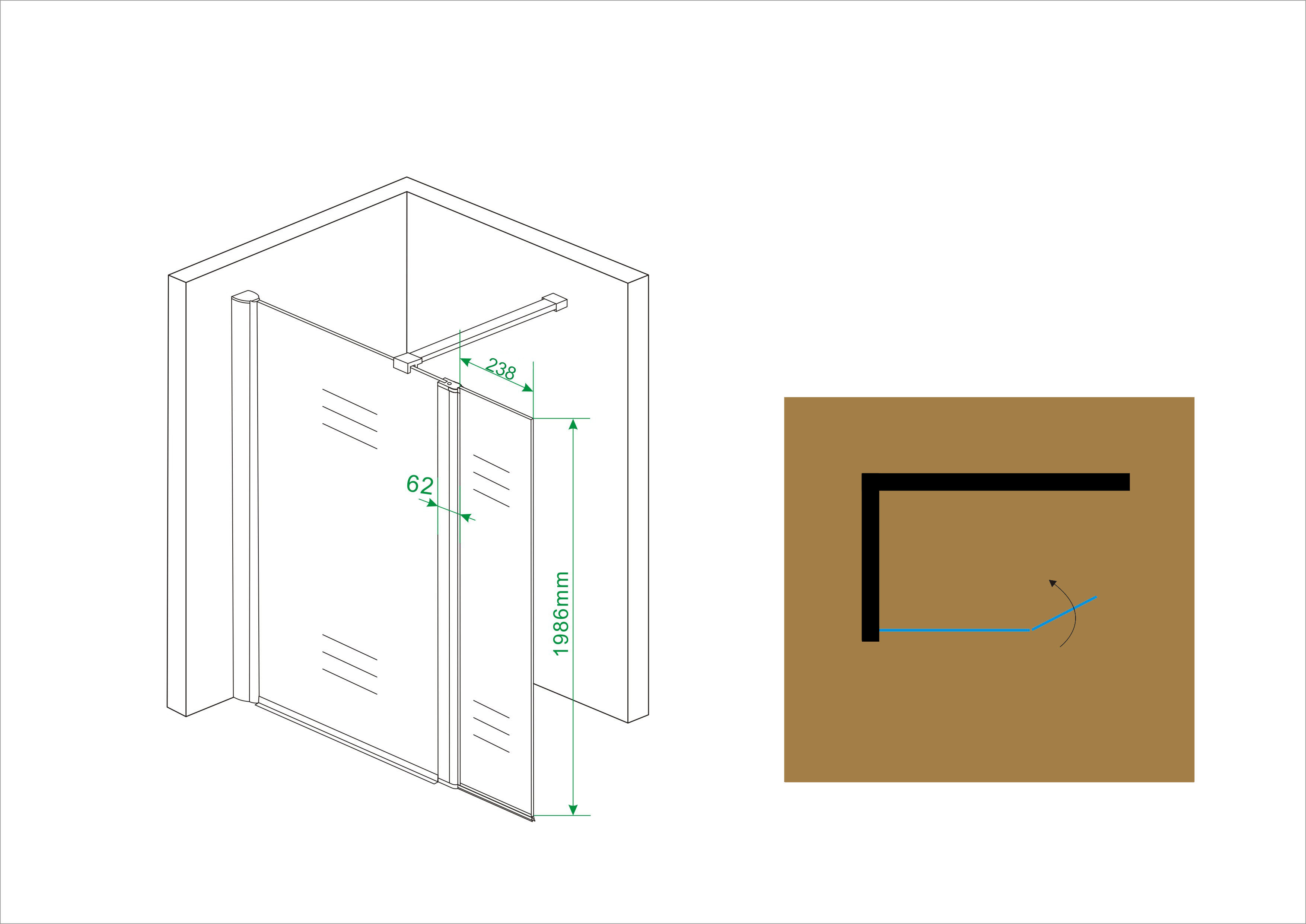 - Paroi latérale pivotante de 300 x 2000 mm, adaptée aux douches à l'italienne avec verre de 10 mm d'épaisseur