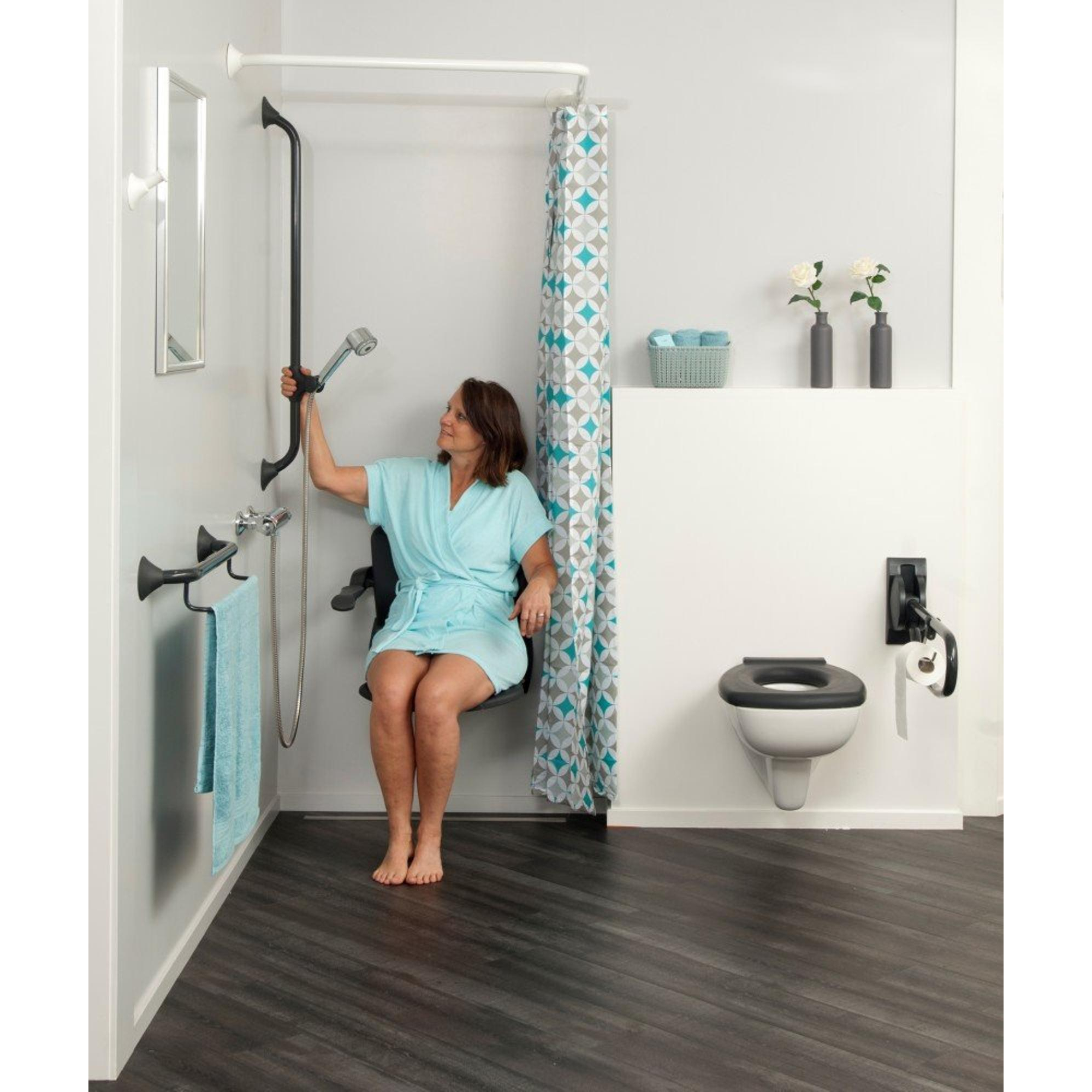 Le support est entièrement relevable, ce qui vous permet de créer facilement plus d’espace de mouvement lorsqu’il n’est pas nécessaire. Idéal dans les toilettes ou salles de bains plus petites où chaque centimètre compte, ou lorsque plusieurs personnes utilisent la pièce et que tout le monde n’a pas besoin d’un appui fixe. Relevé, le support reste compact le long du mur et l’accès autour des toilettes demeure dégagé, par exemple pour un fauteuil roulant, un déambulateur ou un aidant. Vous combinez ainsi sécurité supplémentaire et aménagement pratique de l’espace, sans que l’ensemble paraisse chargé ou clinique.