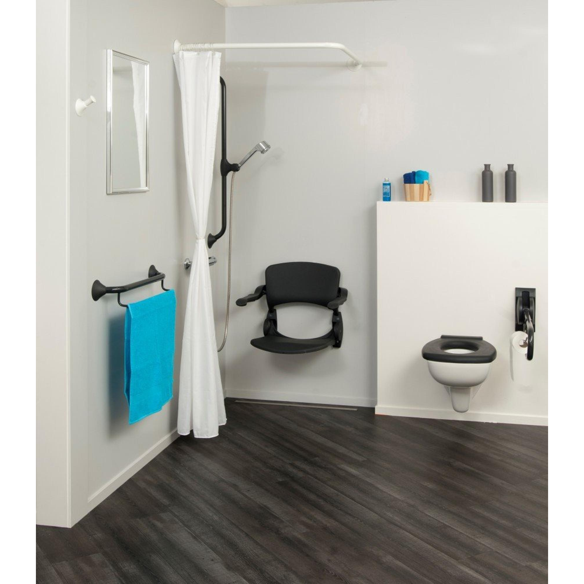 Le revêtement de couleur anthracite s’accorde parfaitement avec les salles de bains modernes dotées d’accents sombres, de robinets noirs mats ou de nuances de gris dans le carrelage et les meubles. L’acier est pourvu d’une protection de surface durable et revêtue, ce qui rend le produit résistant à un usage quotidien et facile à nettoyer avec un produit d’entretien doux. La teinte grise subtile s’accorde en outre très bien avec d’autres aides techniques, de sorte que vous conservez une apparence soignée et harmonieuse plutôt qu’un aspect clinique. Vous ajoutez ainsi une sécurité supplémentaire à votre salle de bains ou à vos toilettes, sans faire de compromis sur le style.