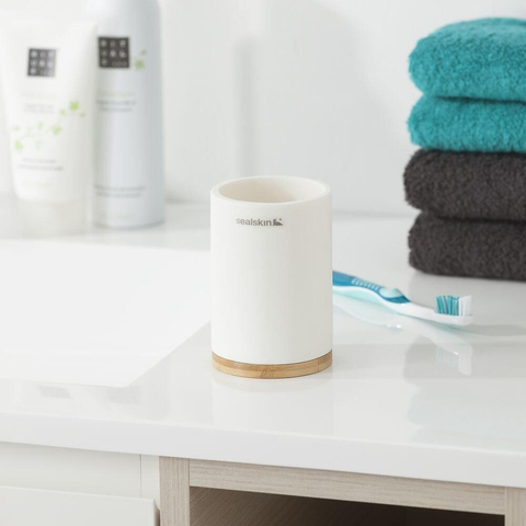 Le mélange de polyresin blanc avec des accents en bambou crée une atmosphère calme et naturelle dans votre salle de bains. Le blanc épuré paraît propre et frais, tandis que le bambou ajoute une note chaleureuse et douce qui s’accorde parfaitement avec les styles d’intérieur populaires comme l’esprit hôtel chic et le style scandinave. Comme le gobelet est autoportant, vous pouvez le placer exactement là où vous en avez besoin : à côté du robinet, sur une tablette ou sur un meuble de salle de bains. Associez-le à d’autres accessoires dans le même style, comme un distributeur de savon ou un porte-savon, pour obtenir un ensemble harmonieux et créer d’un seul coup un look cohérent autour de votre lavabo.
