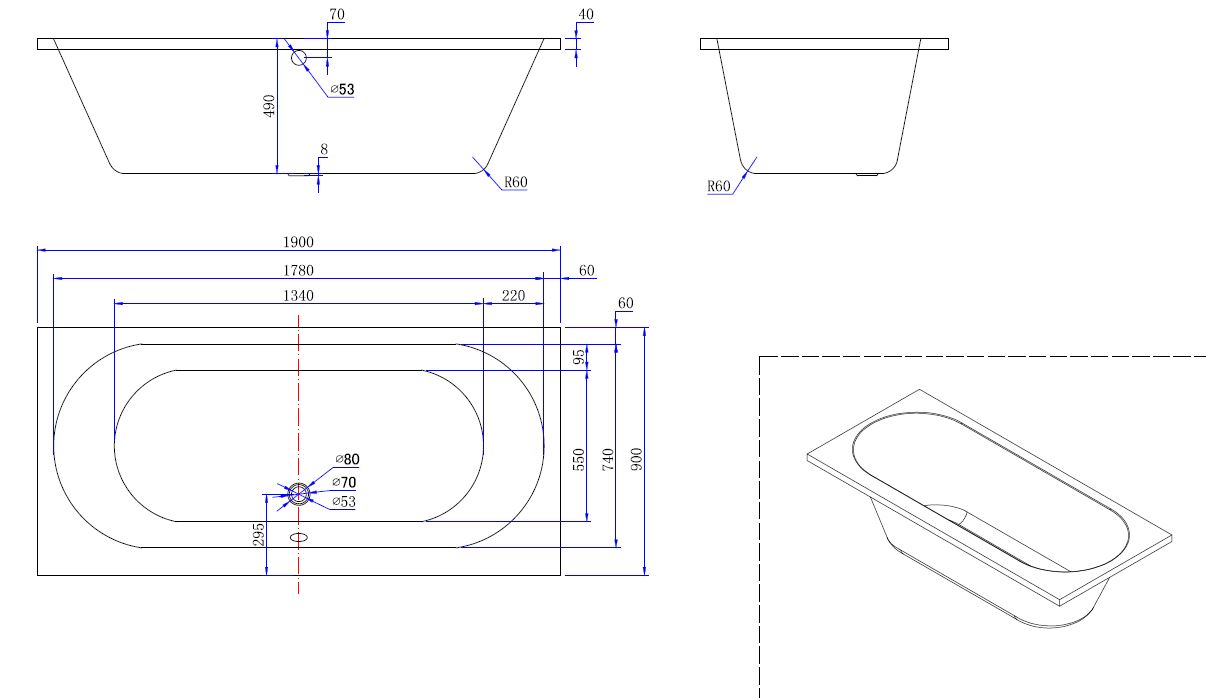 Baignoire arrondie à encastrer Portus 190x90x49 cm