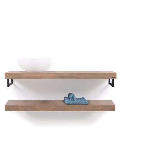 Looox Wood collection Duo étagères murales 120x46cm - 2 pièces - Avec porte-serviettes noir mat - chêne massif gris ancien
