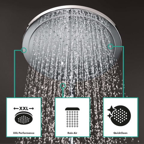 - Pomme de douche de 280 mm de diamètre pour une pluie pleine et douce (RainAir)