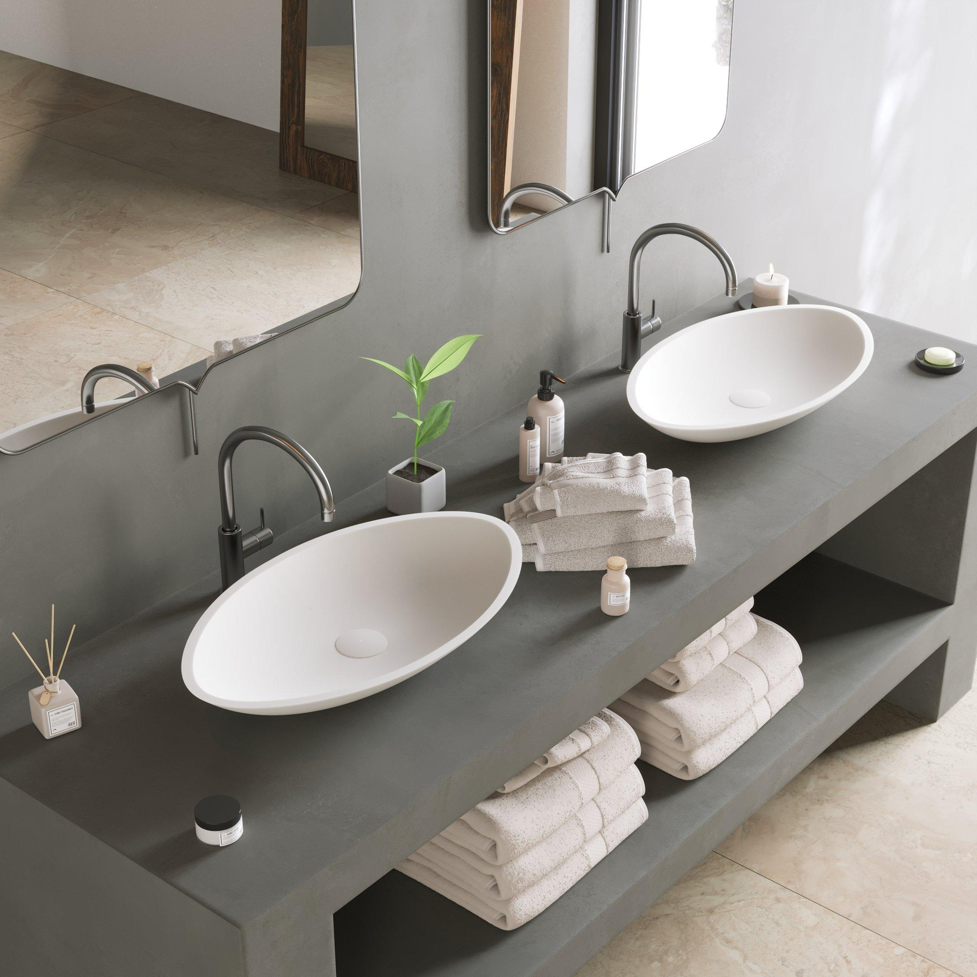 Avec cette élégante vasque à poser, vous donnez en une fois à votre salle de bains ou à vos toilettes un aspect moderne et apaisant. La couche supérieure mate et veloutée est chaude et agréable au toucher, tandis que la forme ovale apporte un look doux et organique qui se marie harmonieusement aussi bien avec des meubles de design épurés qu’avec des matériaux naturels comme le bois et l’effet béton. Grâce au format compact de 60x35 cm, cette vasque s’adapte parfaitement sur un plan de lavabo étroit ou dans une petite salle de bains, sans sacrifier le confort pour se laver les mains ou le visage. Comme aucun trou de robinet n’est pré-percé, vous êtes entièrement libre de choisir un mitigeur à poser sur le plan ou un élégant robinet mural. Cela rend ce modèle particulièrement adapté à ceux qui recherchent une salle de bains minimaliste, avec une finition haut de gamme où les détails font la différence.
