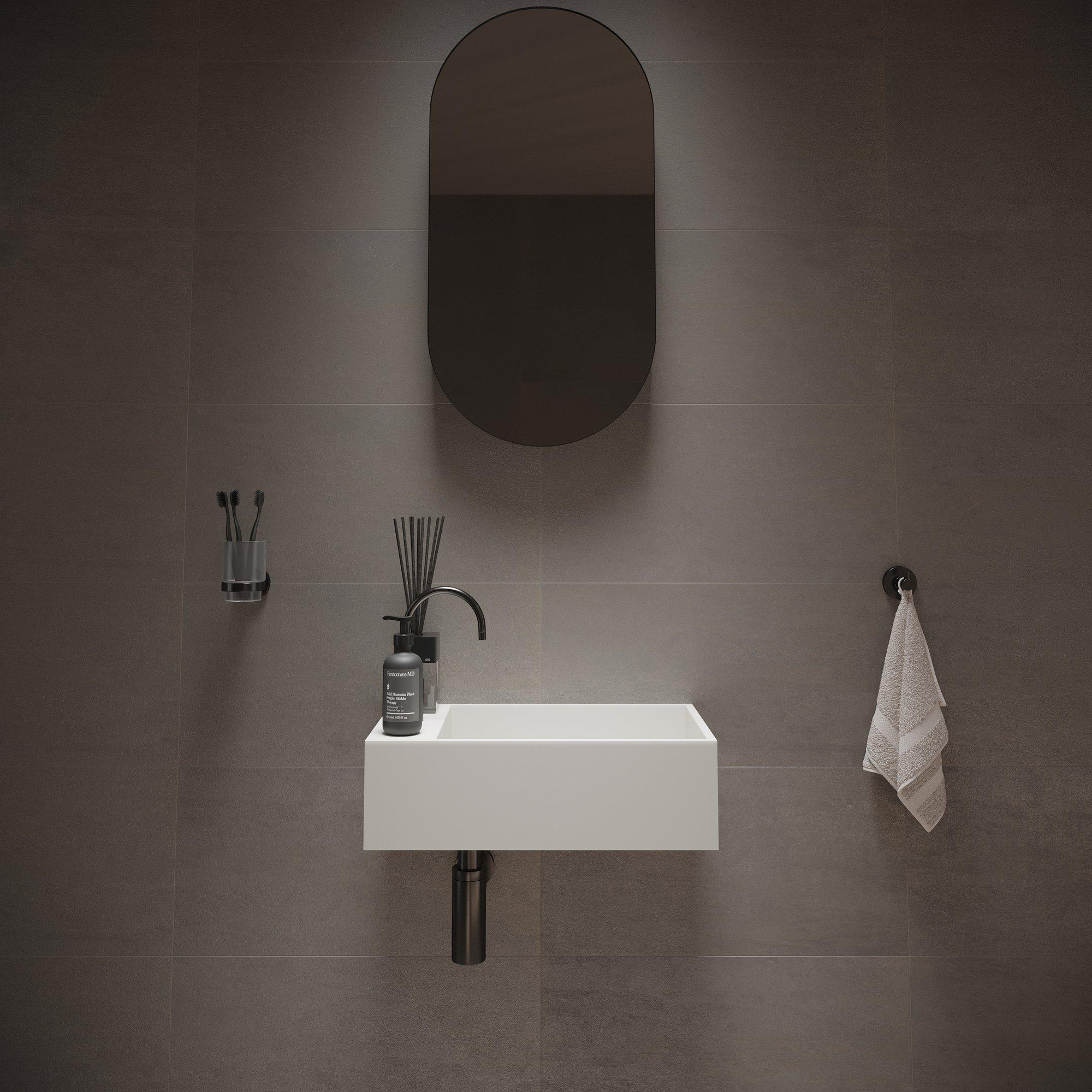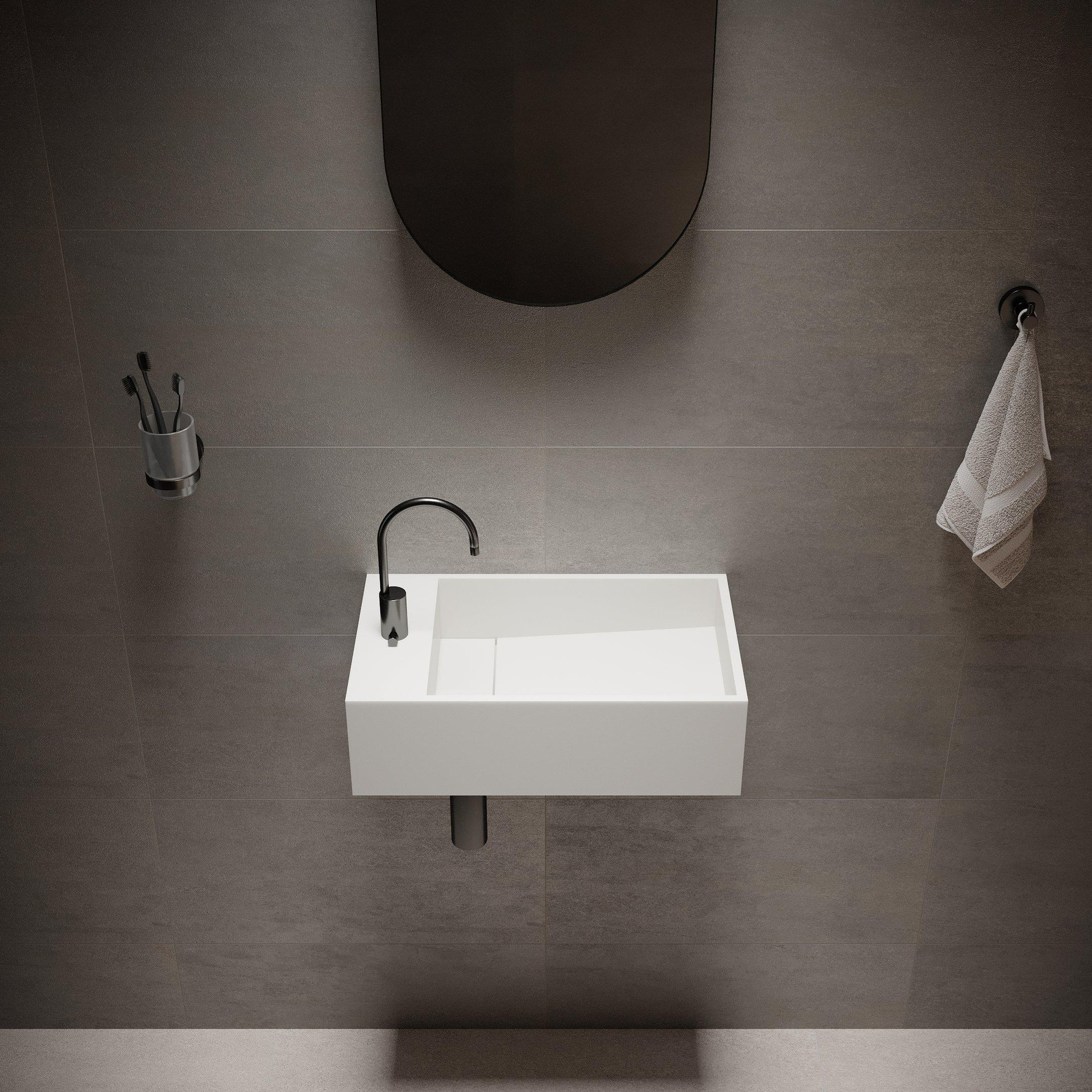 Avec des dimensions de 50x30x15 cm, c’est un choix astucieux pour les toilettes, les niches ou les salles de bains étroites où l’espace de circulation est limité. La forme rectangulaire s’ajuste parfaitement contre le mur tout en offrant une profondeur suffisante pour vous laver confortablement les mains. Comme le trou de robinet se trouve sur le côté droit, la vasque elle-même reste suffisamment spacieuse et pratique à l’usage. La discrète rigole d’évacuation au fond maintient l’ensemble épuré et minimaliste, sans pièces détachées visibles. Vous créez ainsi un point d’eau pratique pour le lavage des mains qui ne domine pas la pièce, mais s’intègre harmonieusement à l’espace et contribue à un aménagement calme et bien pensé.