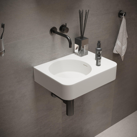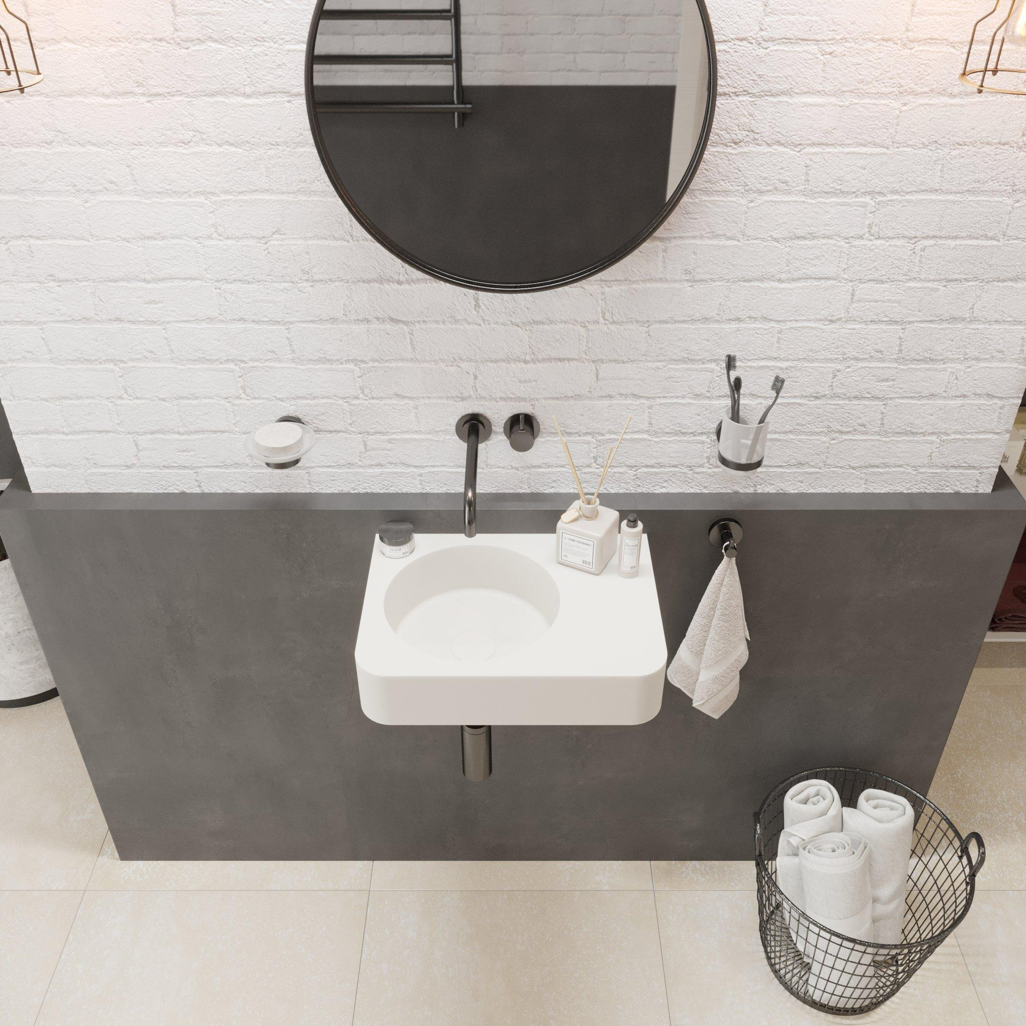 La surface est réalisée en solid surface : un matériau robuste et non poreux, réputé pour ses propriétés hygiéniques et durables. La couche supérieure blanche mate, au toucher velouté, est agréable au contact et se nettoie facilement avec un chiffon doux et un détergent doux. Comme il n’y a pas de pores ouverts, la saleté, le calcaire et les résidus de savon pénètrent moins rapidement, ce qui est idéal pour une utilisation intensive dans les WC ou la salle de bains. Les petites traces d’utilisation peuvent souvent être facilement réparées en ponçant légèrement, de sorte que votre lave-mains conserve longtemps son aspect neuf.