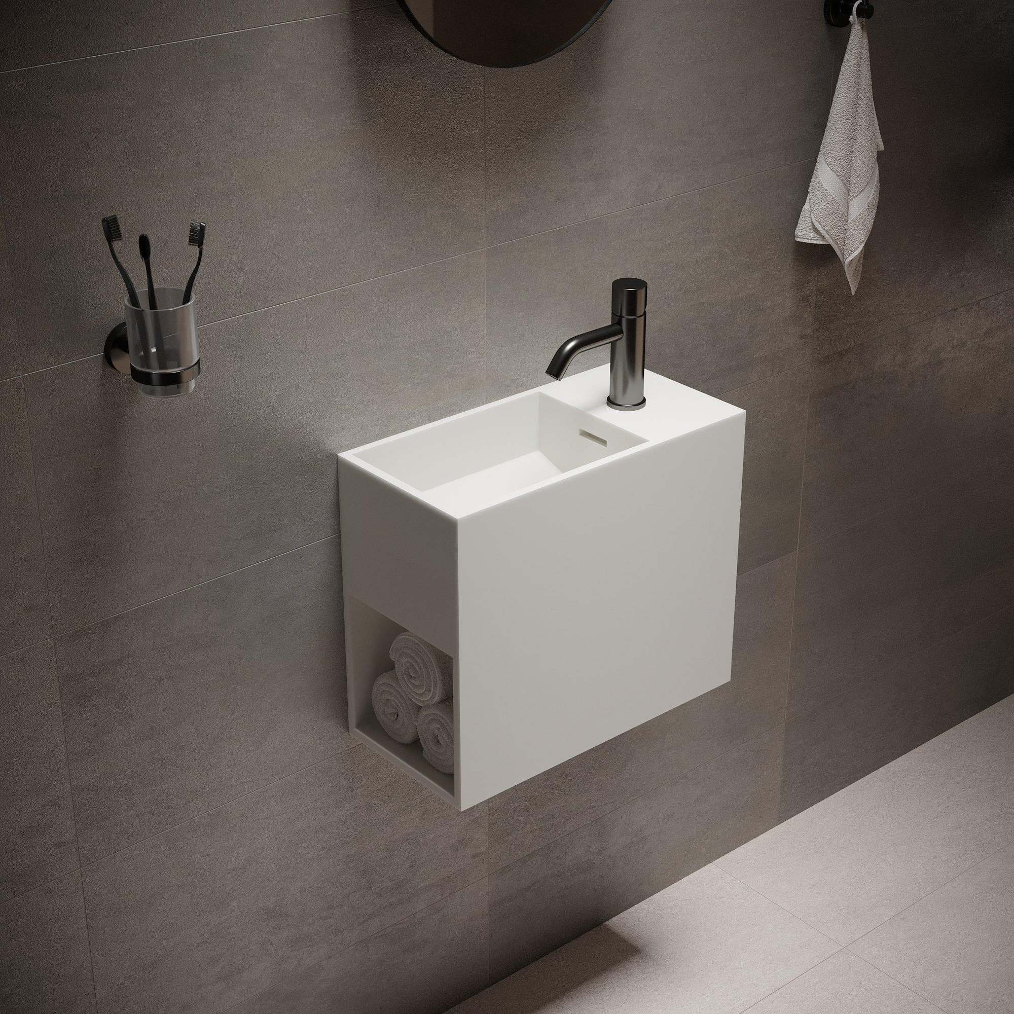 Avec une largeur de 45 cm et une profondeur de seulement 22 cm, vous exploitez de manière optimale l'espace disponible, sans sacrifier le confort. La forme rectangulaire crée une ligne épurée et calme le long du mur, tandis que la vasque unique est suffisamment spacieuse pour vous permettre de vous laver les mains confortablement. Le trou de robinet à droite vous offre une orientation claire pour le montage et facilite le choix d'une robinetterie de fontaine assortie. Le compartiment ouvert sous le lavabo est idéal pour ranger des serviettes ou des accessoires à portée de main, de sorte que vous n'avez pas besoin d'étagère ou de meuble supplémentaires. Vous créez ainsi des toilettes ordonnées et bien pensées, dans lesquelles chaque centimètre est bien utilisé.