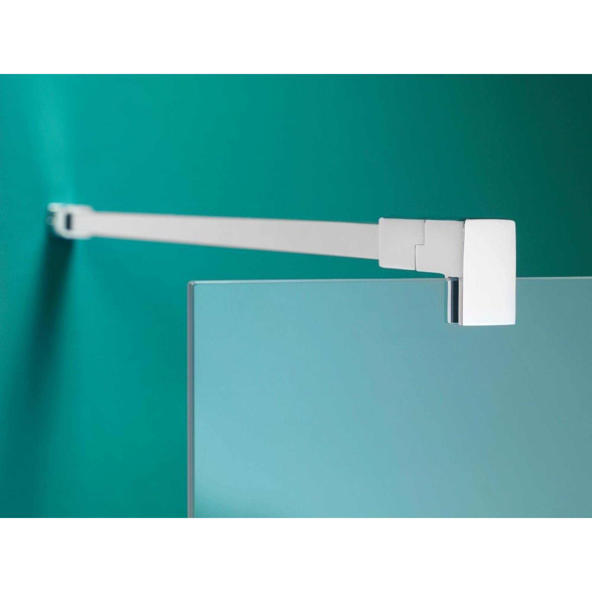 - Configuration de douche sans profilés avec porte pivotante et paroi latérale pour un look épuré et transparent.
