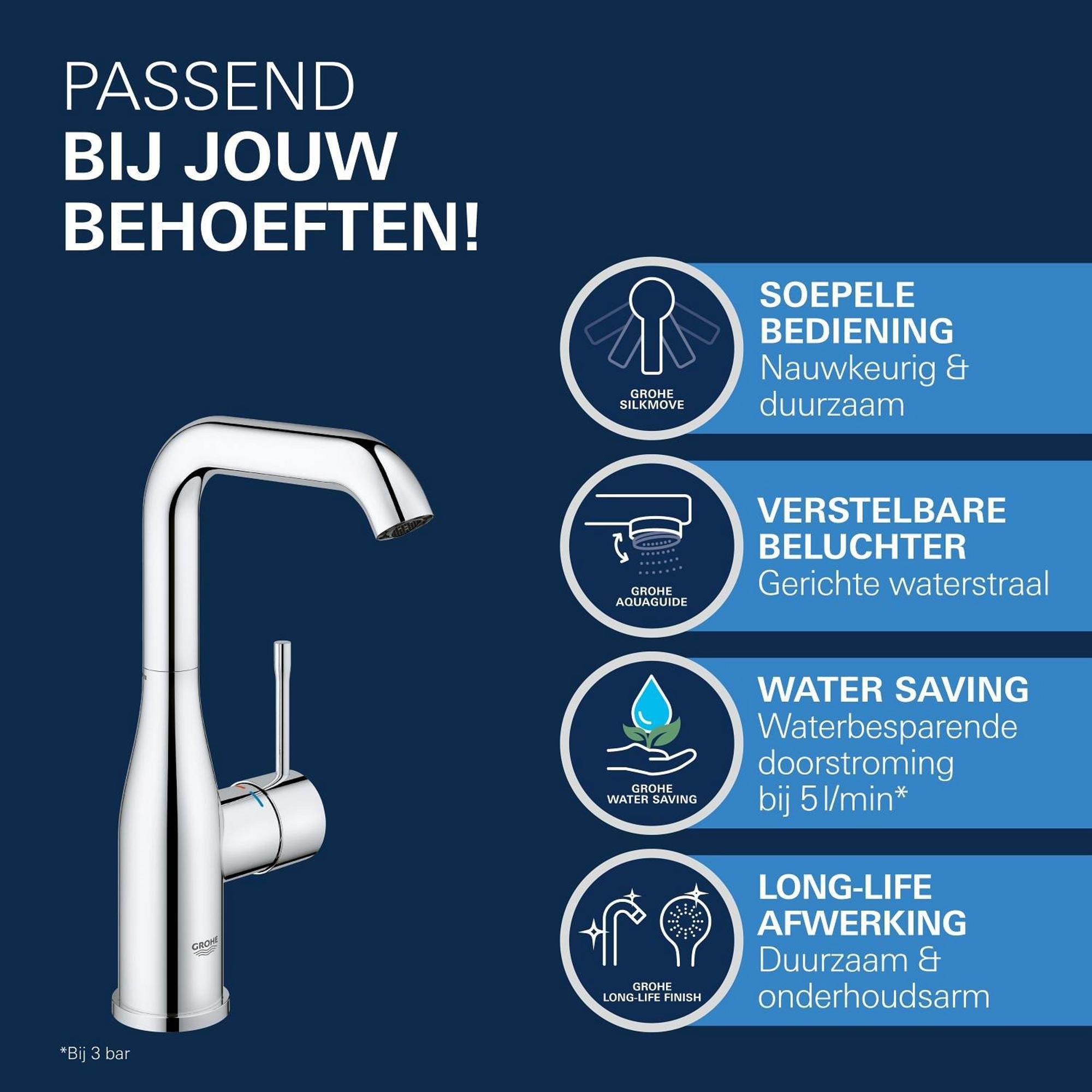 Ce mitigeur se distingue immédiatement par ses lignes modernes et épurées et par sa finition chromée brillante qui dégage une élégance intemporelle. Le design minimaliste lui permet de s’harmoniser parfaitement avec des intérieurs de salle de bains très variés, du classique au contemporain. Grâce au bec extra haut, votre lavabo bénéficie d’un aspect luxueux et vous disposez de plus d’espace pour travailler confortablement. De plus, le mitigeur reste beau pendant des années, même en cas d’utilisation intensive, grâce à la couche de chrome Long-Life durable. Vous profitez ainsi non seulement d’un ajout raffiné, mais aussi d’une salle de bains qui reste belle durablement.