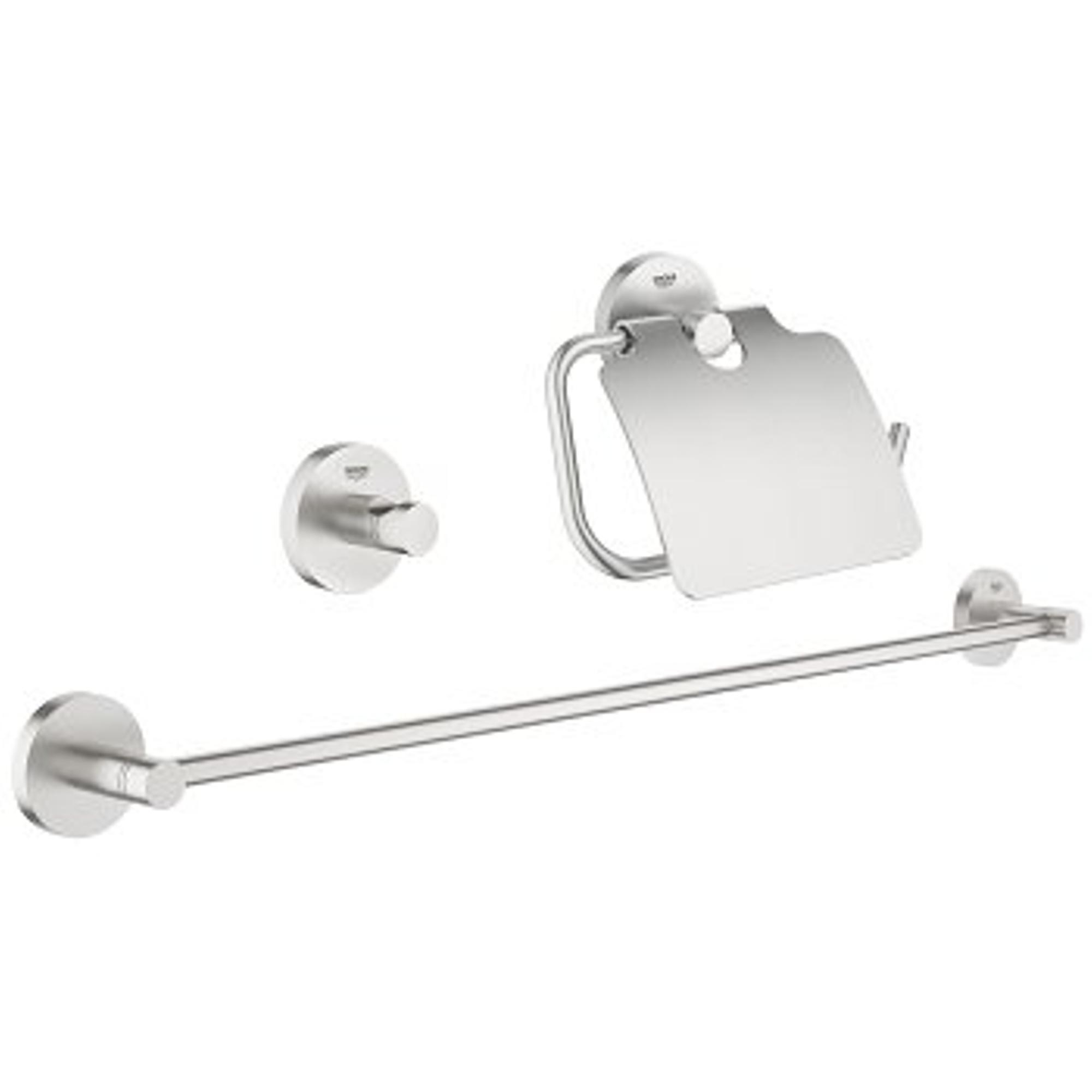 GROHE Essentials Ensemble d’accessoires de WC 3 pièces avec porte-balai de WC, patère et porte-rouleau de papier toilette avec couvercle supersteel