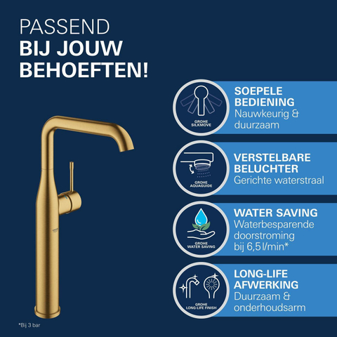GROHE Essence New robinet lavabo XL avec bec haut tournantEcoJoy cool sunrise brossé (or)
