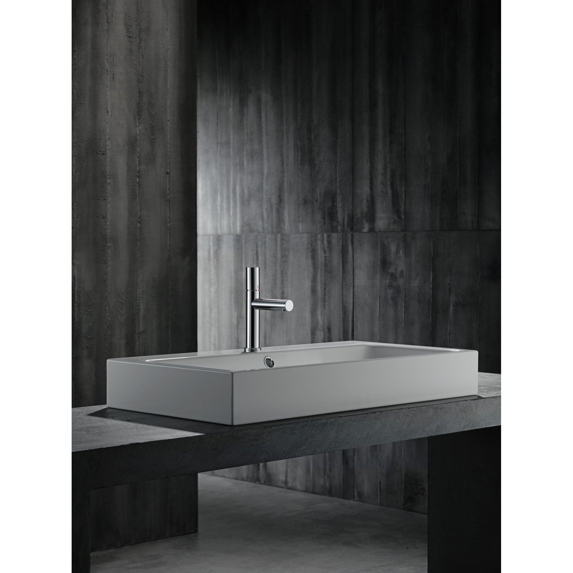Le design minimaliste avec des lignes cylindriques et tubulaires offre un aspect épuré et ordonné sur votre lavabo. La finition chromée brillante s’harmonise parfaitement avec les autres éléments chromés de la salle de bains, tels que la douche, le thermostat et les accessoires, ce qui vous permet de créer facilement un ensemble cohérent. Comme le robinet est bas et relativement peu massif, il est particulièrement adapté aux petits espaces ou aux lavabos compacts où vous souhaitez tout de même une apparence luxueuse. Le design dit à poignée zero a un aspect particulièrement épuré : aucune forme superflue, uniquement fonctionnalité et design purs. Vous faites ainsi entrer chez vous un véritable robinet design qui ne se veut pas tape‑à‑l’œil, mais qui dégage une classe subtile.