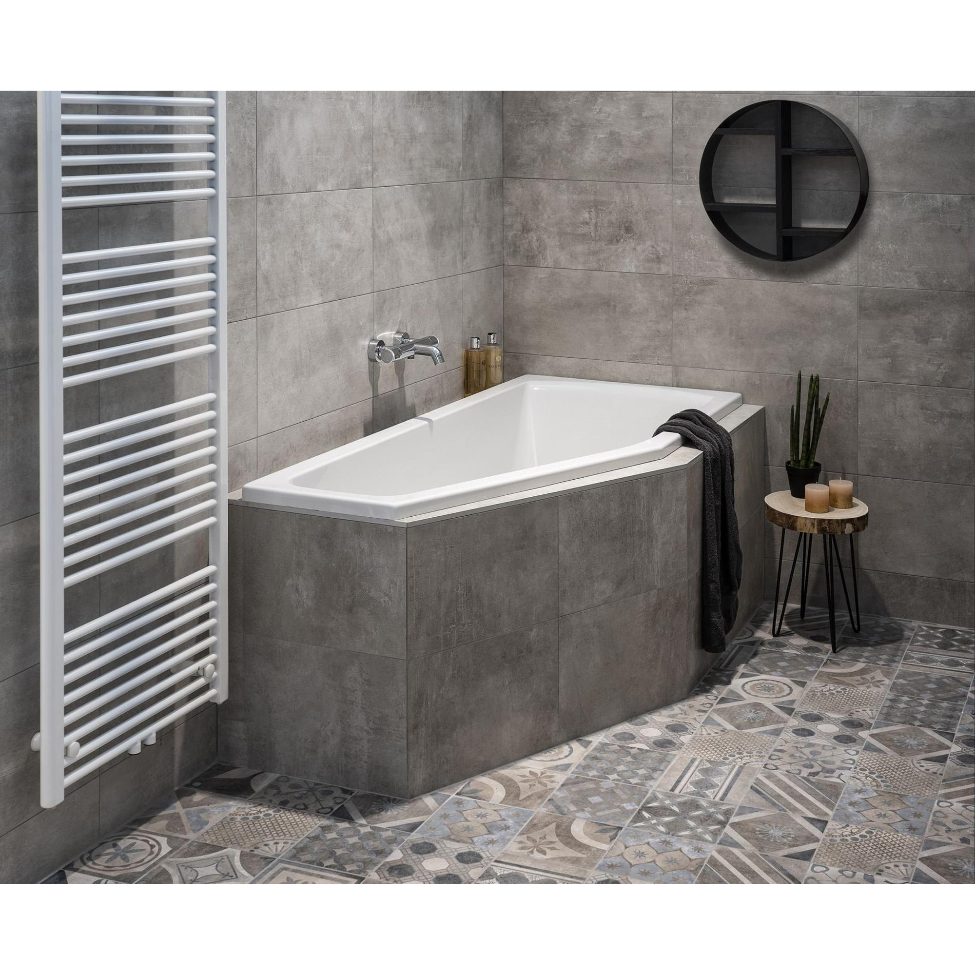 - Baignoire d'angle compacte de 160x75x48 cm, idéale pour les petites et moyennes salles de bains.