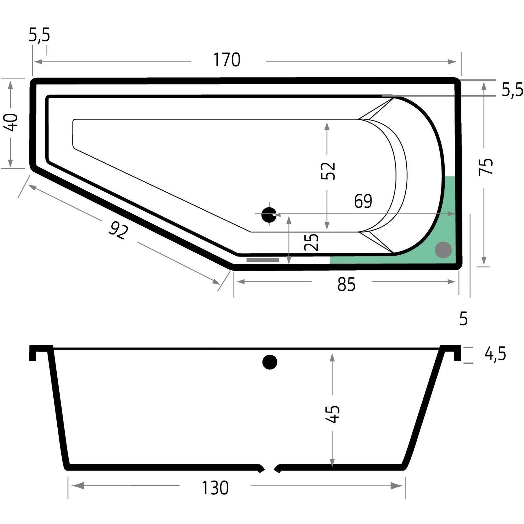 - Baignoire d’angle compacte de 170x75x48 cm, idéale pour les salles de bains moyennes et petites.