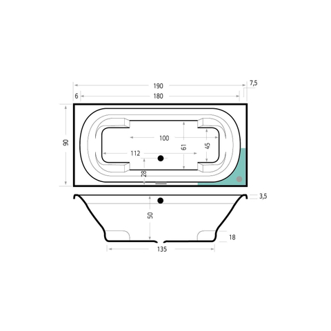 - Baignoire duo spacieuse de 190x90x53 cm, idéale pour se baigner à deux ou seul avec un confort supplémentaire.