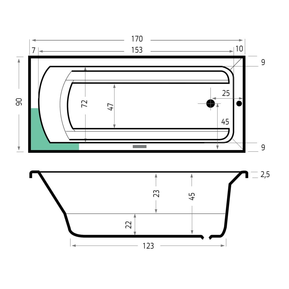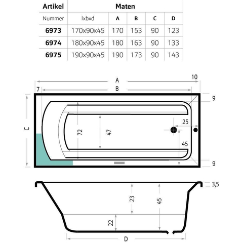 Xenz Bodysize Ligbad - 170x90x48 - afvoer uiteinde - acryl - wit