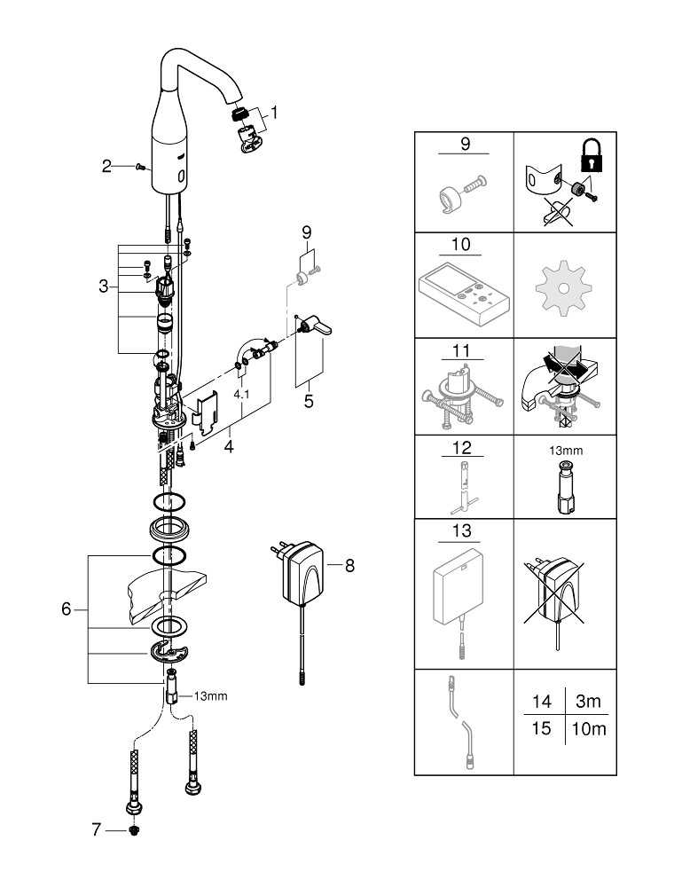 La commande électronique avec capteur infrarouge rend l’utilisation particulièrement hygiénique et confortable. Vous n’avez pas besoin de toucher le robinet, ce qui évite la propagation des bactéries. Avec sept programmes préréglés tels que le rinçage automatique, la désinfection thermique et un mode de nettoyage, vous réglez facilement le robinet selon vos souhaits. Les flexibles de raccordement, clapets antiretour et filtres à impuretés assurent une installation et un entretien sans problème. Grâce au système de montage rapide, vous installez en outre le robinet rapidement et facilement, afin de profiter immédiatement de sa facilité d’utilisation.