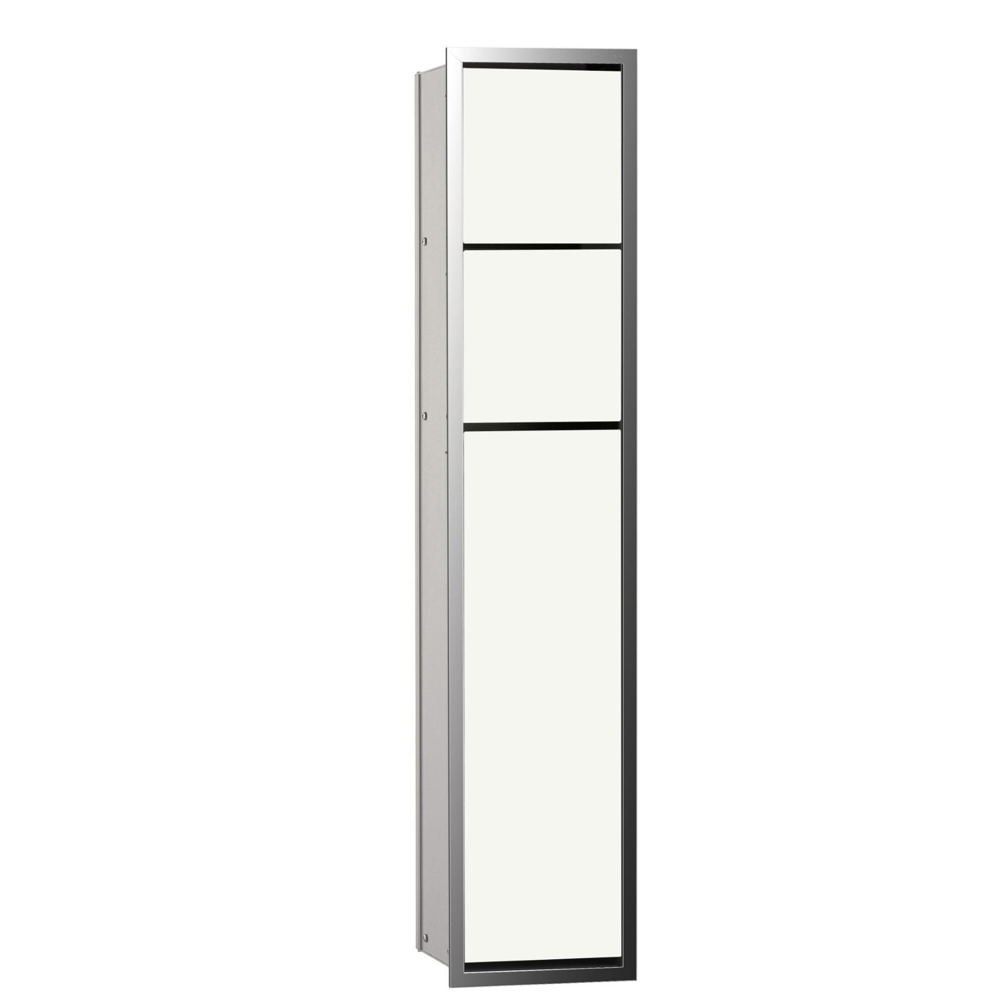 Avec ce module encastré élégant, vous donnez en une fois à vos toilettes un aspect ordonné et luxueux. Tous les accessoires nécessaires – papier toilette, rouleau de réserve et brosse de WC – disparaissent soigneusement derrière une façade épurée en verre blanc avec encadrement couleur chrome. Cela rend ce produit particulièrement adapté aux espaces de toilettes modernes où le calme et une finition soignée sont importants, par exemple dans une maison design, un WC invités de luxe ou une salle de bains à domicile digne d'un hôtel. Comme tout est intégré dans le mur, l'espace autour des toilettes reste dégagé et même un petit WC paraît plus grand et plus apaisant. Si vous recherchez une solution durable et pratique qui reste belle pendant de nombreuses années tout en étant simple d'utilisation, ce module encastré est un choix judicieux.