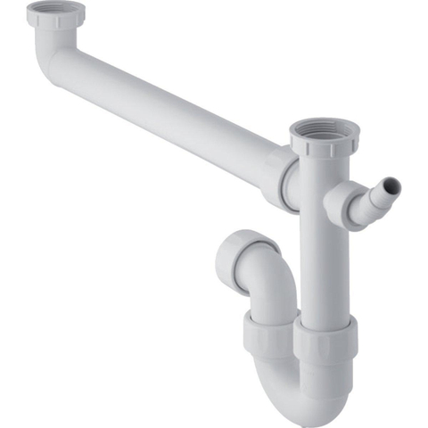 Cette version est équipée d’un embout de raccordement pour tuyau, qui vous permet de raccorder aisément un appareil tel qu’un lave-vaisselle ou un lave-linge au siphon. Le piquage convient pour des diamètres de tuyau d’environ 19-23 mm et se raccorde à une connexion DN40. Vous combinez ainsi l’évacuation de votre double lavabo avec celle de vos appareils, sans trous supplémentaires dans le mur ni siphons séparés. Cela réduit le temps d’installation, économise de la place sous le plan de travail et diminue le risque de fuites dû à un enchevêtrement de raccordements séparés. Surtout dans les petites salles de bains ou cuisines, il s’agit d’une solution agréable et peu encombrante.