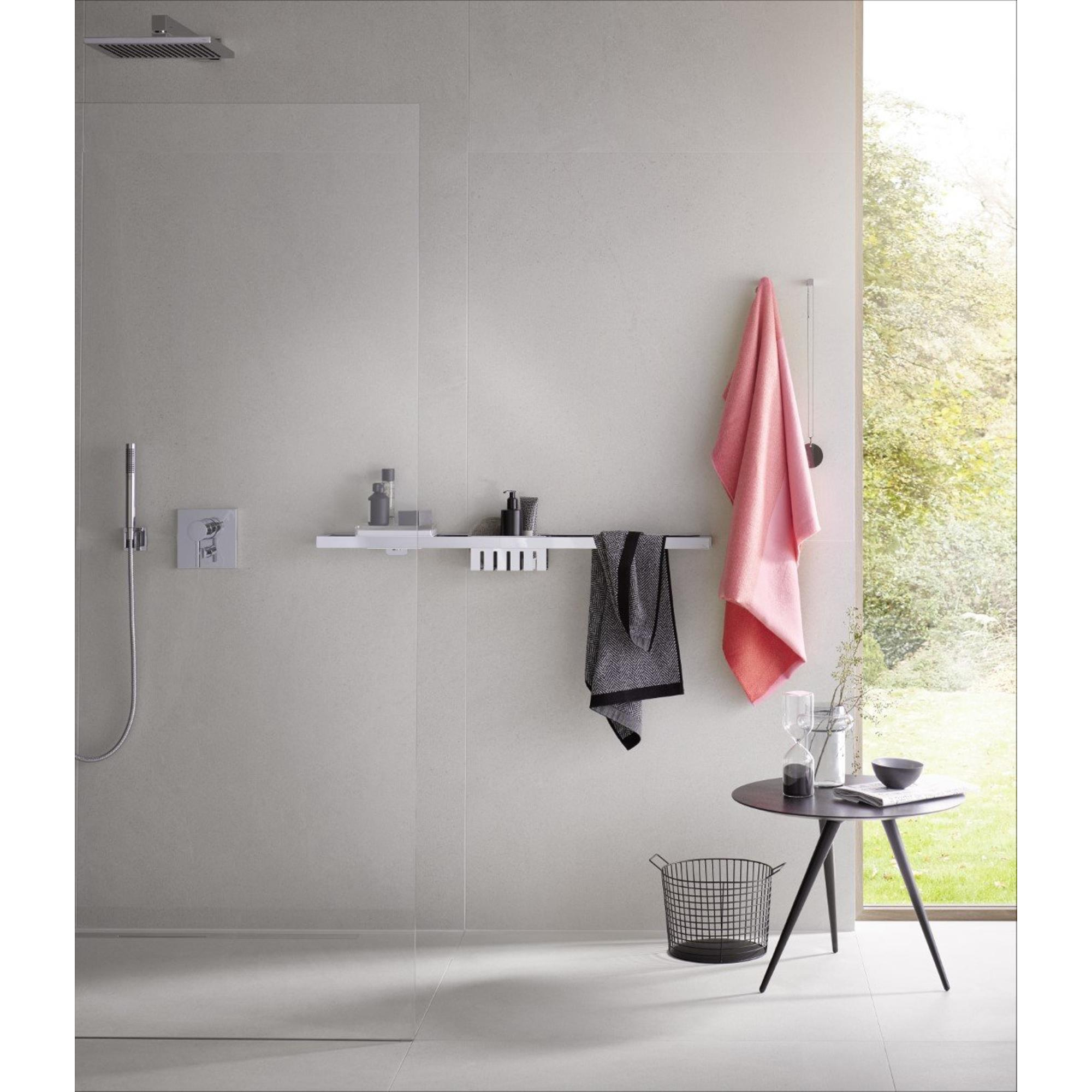 - Conçu pour une fixation sur un système de barre, pour un aménagement net et flexible de la paroi de douche.
