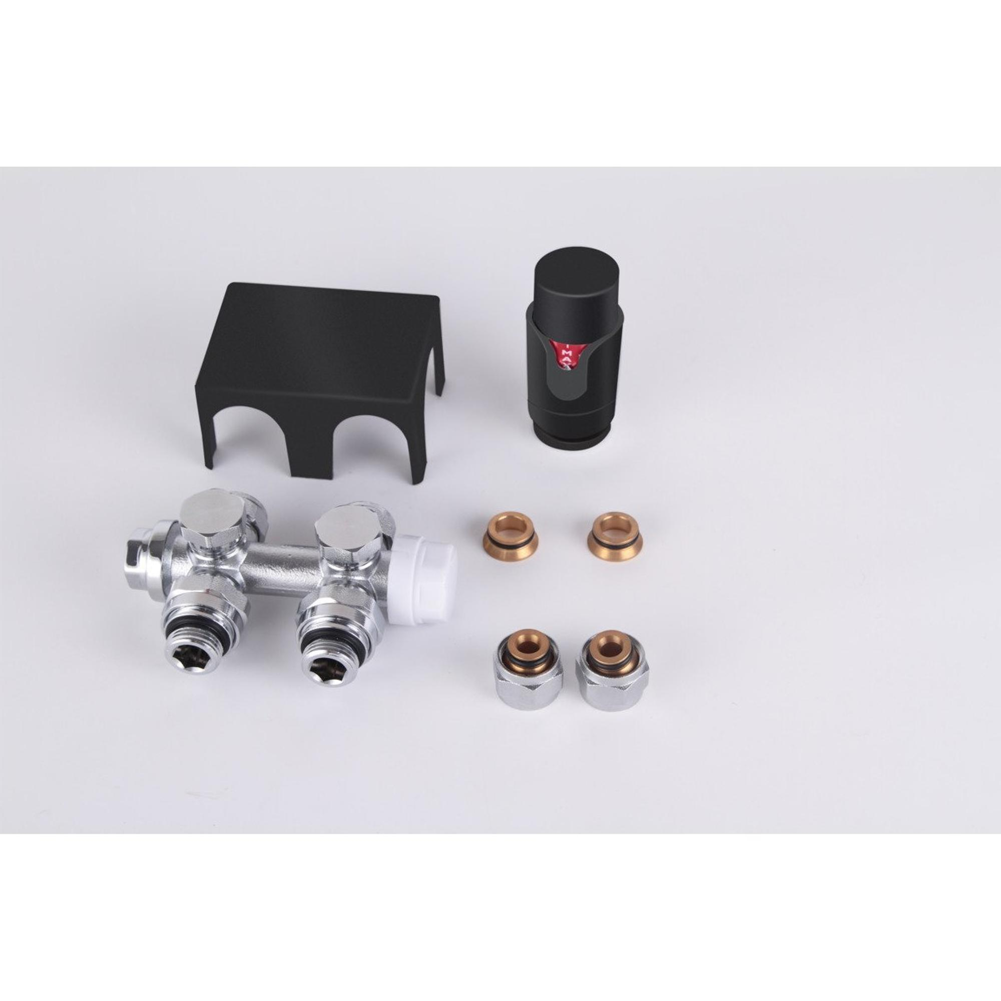 Avec un bloc de raccordement universel, vous bénéficiez de deux avantages : un raccordement soigné et un aspect visuel calme sur le mur. Les conduites de départ et de retour se rejoignent dans un seul bloc compact, ce qui évite d’avoir un enchevêtrement de raccords et de coudes visibles. La couleur noir mat s’harmonise parfaitement avec les styles de salle de bains populaires tels qu’industriel, moderne ou hôtel chic. Combinez-le avec un radiateur noir ou au contraire avec un radiateur blanc pour un contraste puissant ; dans les deux cas, l’ensemble paraît réfléchi et bien fini. Grâce à sa conception compacte, plus d’espace reste visible, ce qui peut faire une grande différence surtout dans les petites salles de bains et les toilettes.Confort d’un bouton thermostatique intégré