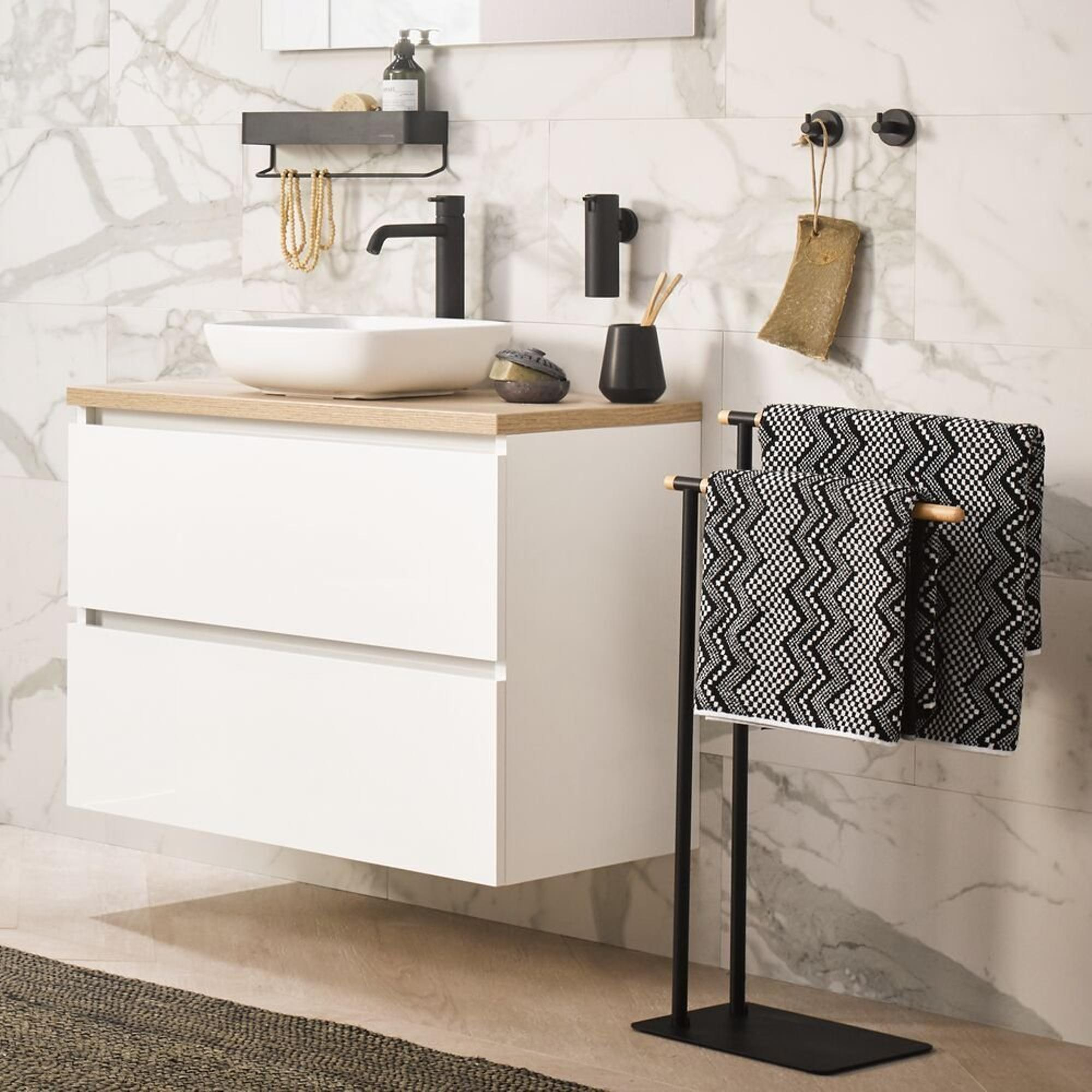 Ce porte-serviettes autoportant est idéal si vous recherchez un espace de suspension supplémentaire sans percer dans un mur ou un carrelage. Grâce à son format compact, il s’intègre facilement aussi bien dans une petite salle de bains que dans un espace bien-être plus vaste, et même à côté d’une douche à l’italienne ou d’une baignoire, il trouve parfaitement sa place. La combinaison de métal noir et de bois chaud offre un look scandinave moderne qui s’accorde parfaitement avec les styles de salle de bains populaires tels qu’industriel, minimaliste ou hôtel chic. Comme vous pouvez y suspendre plusieurs serviettes à la fois, il est parfait pour un foyer où l’on prend régulièrement des douches ou des bains. Si vous cherchez une solution à la fois élégante et pratique pour garder les serviettes bien rangées et à portée de main, c’est un choix judicieux.Design scandinave avec des accents chaleureux