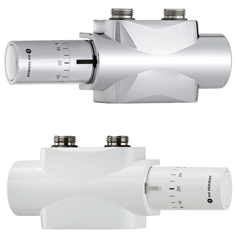 IMI Heimeier Multilux 4 jeu de robinetterie bitube inférieur avec Halo, droit et équerre R1/2 - G3/4 entraxe 50 mm version design chrome