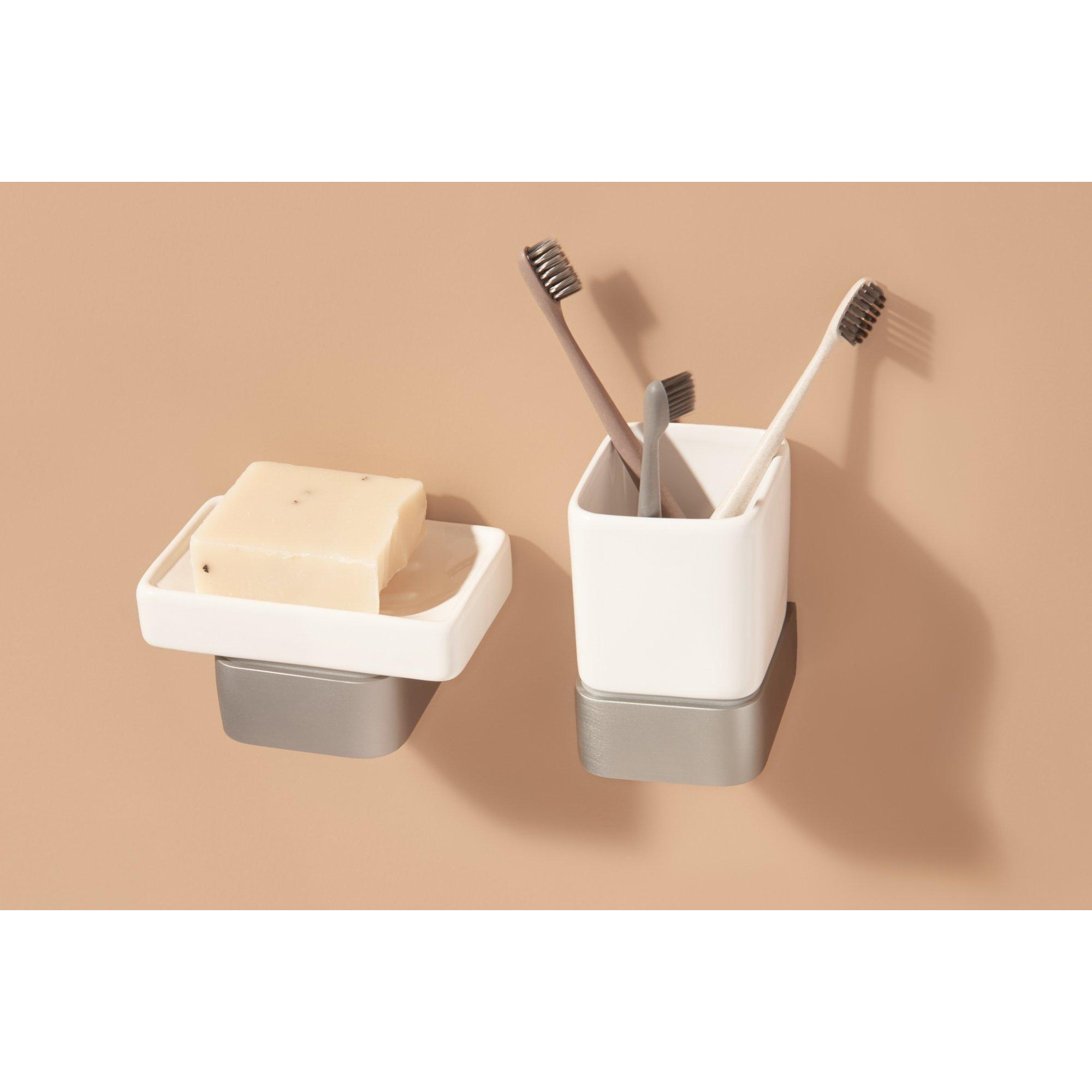 La combinaison d'un support en aluminium et d'un gobelet en céramique assure un accessoire solide et durable qui résiste aux chocs. L'aluminium est léger, robuste et résistant à l'humidité, ce qui le rend particulièrement adapté à une utilisation intensive dans la salle de bains. Le gobelet en céramique offre une sensation de solidité, se nettoie facilement et ne se décolore pas rapidement. Cela signifie que vous profitez pendant des années d'une apparence nette et fraîche. De plus, la surface du support comme du gobelet est facile à essuyer avec un chiffon doux, de sorte que les éclaboussures de dentifrice ou d'eau n'ont aucune chance de s'accumuler. Votre environnement de lavabo reste ainsi hygiénique et soigné, sans entretien compliqué.